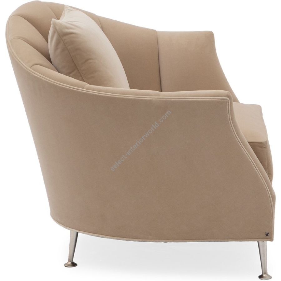 Sumptuously upholstered with a distinctive “off the shoulder” styled back, this elegant lounge chair includes hand-wrought metal legs that complement the deeply cushioned seat. Pair with Alexandrine Gauche (60-0389) for perfect symmetry.