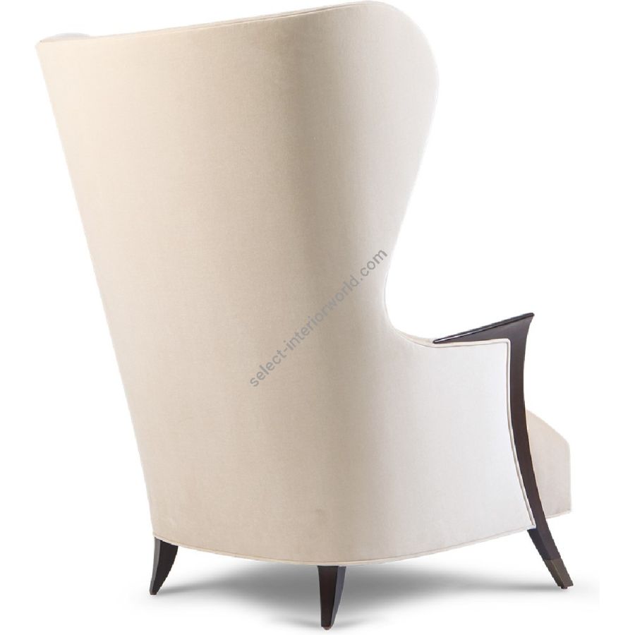 A chic and comfortable occasional chair featuring hand-carved armrests that sweep through the metal finish tipped legs, complemented by a perfectly formed curved winged backrest, enhanced by a row of buttons.