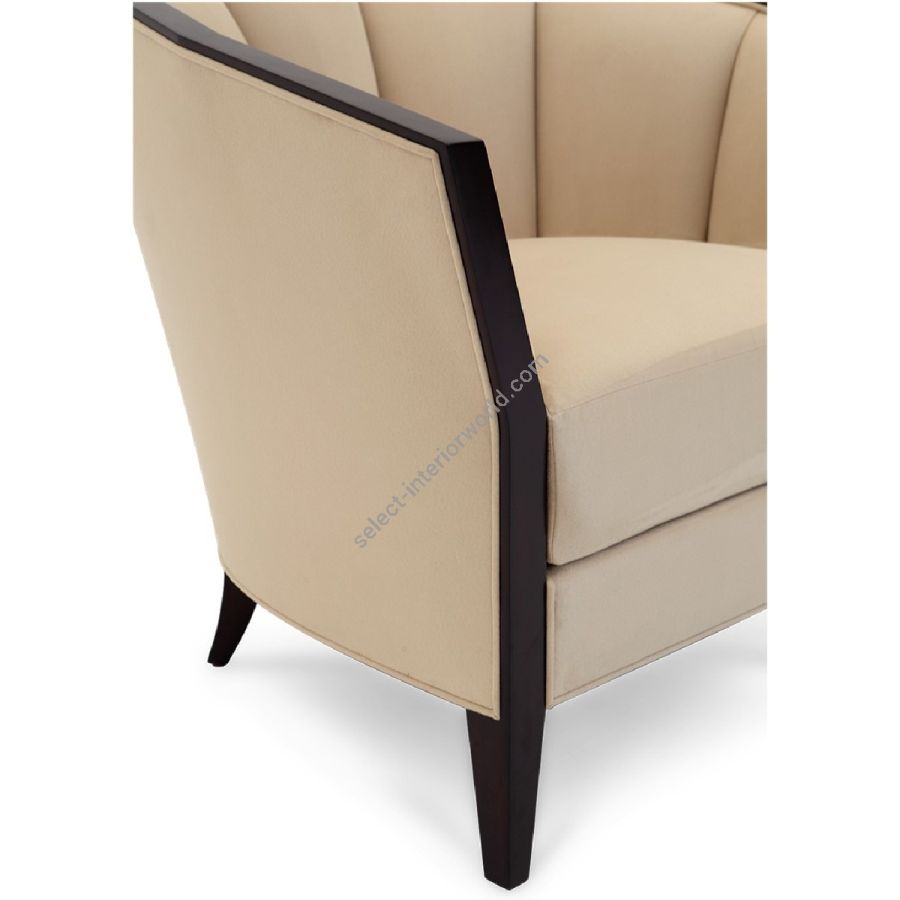 This magnificent angular club chair features a scalloped back with mahogany detailing flowing meaningfully into the legs. A sumptuous deep seat rounds off the fabulous understated chair.