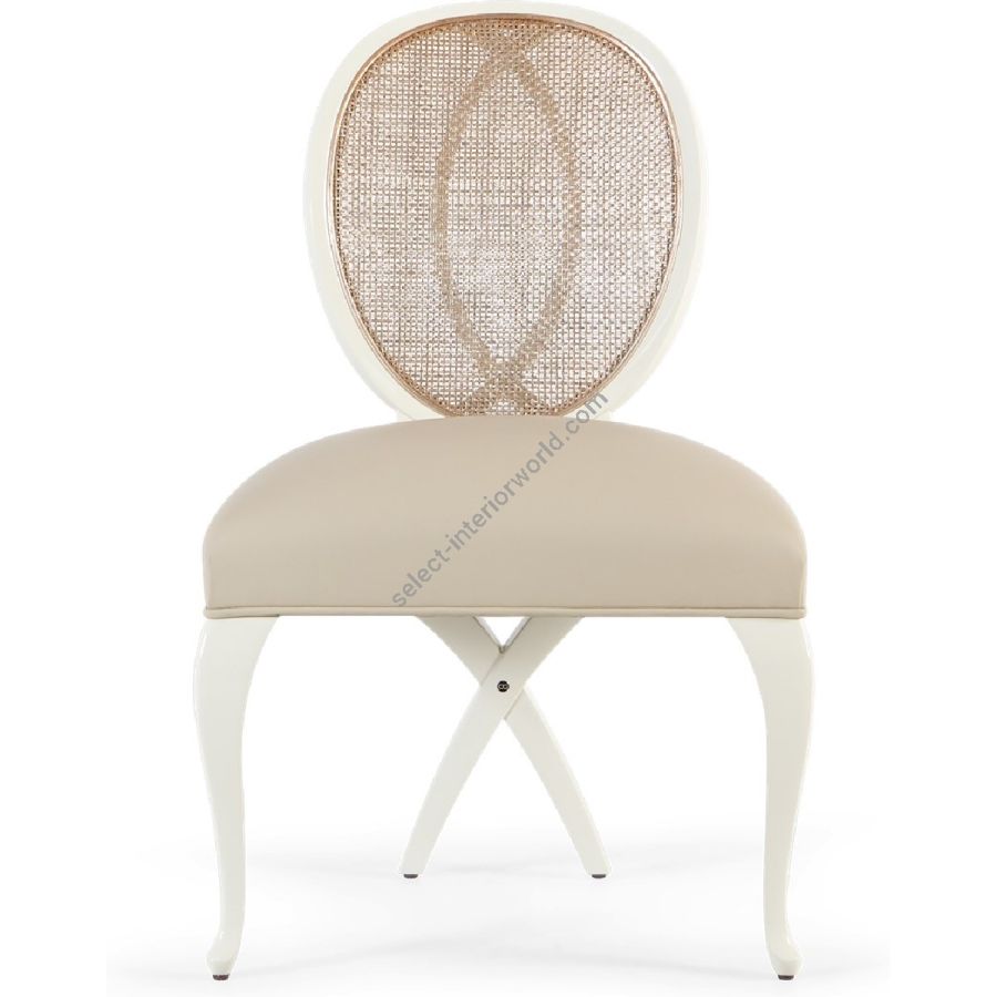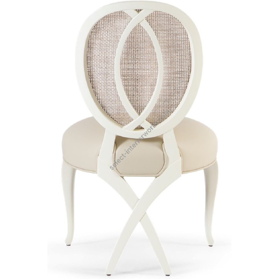 This captivating chair features a rattan back applied over a mahogany frame. Its distinct and sumptuous upholstered silhouette is the ultimate in visual comfort. Also available with armrests: 30-0112