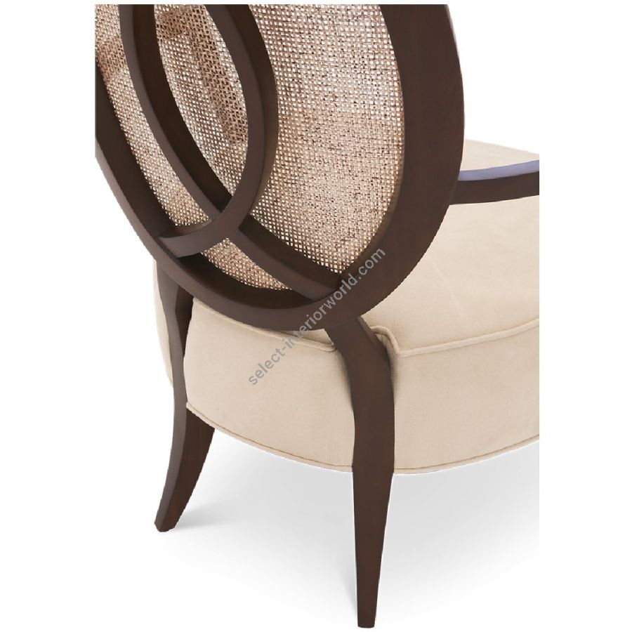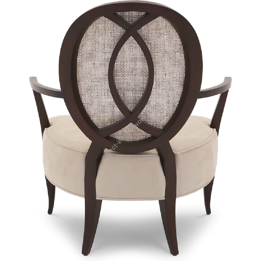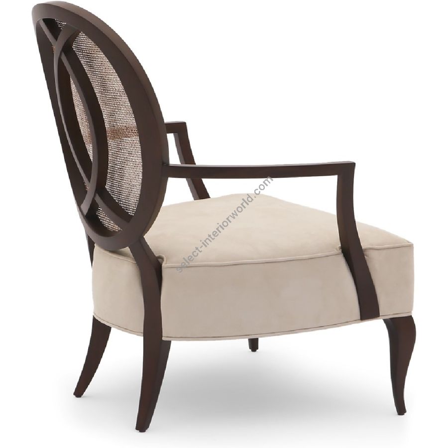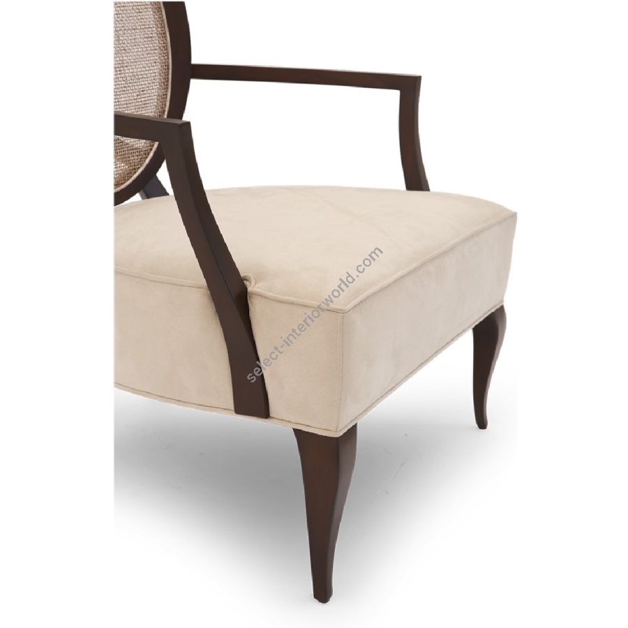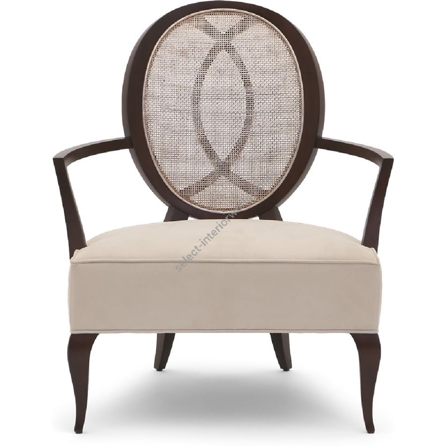 An artfully understated lounge chair with a sumptuously upholstered seat and a distinctive oval back of hand-carved mahogany. Cabriole legs balance the Deco style mahogany arm rests.
