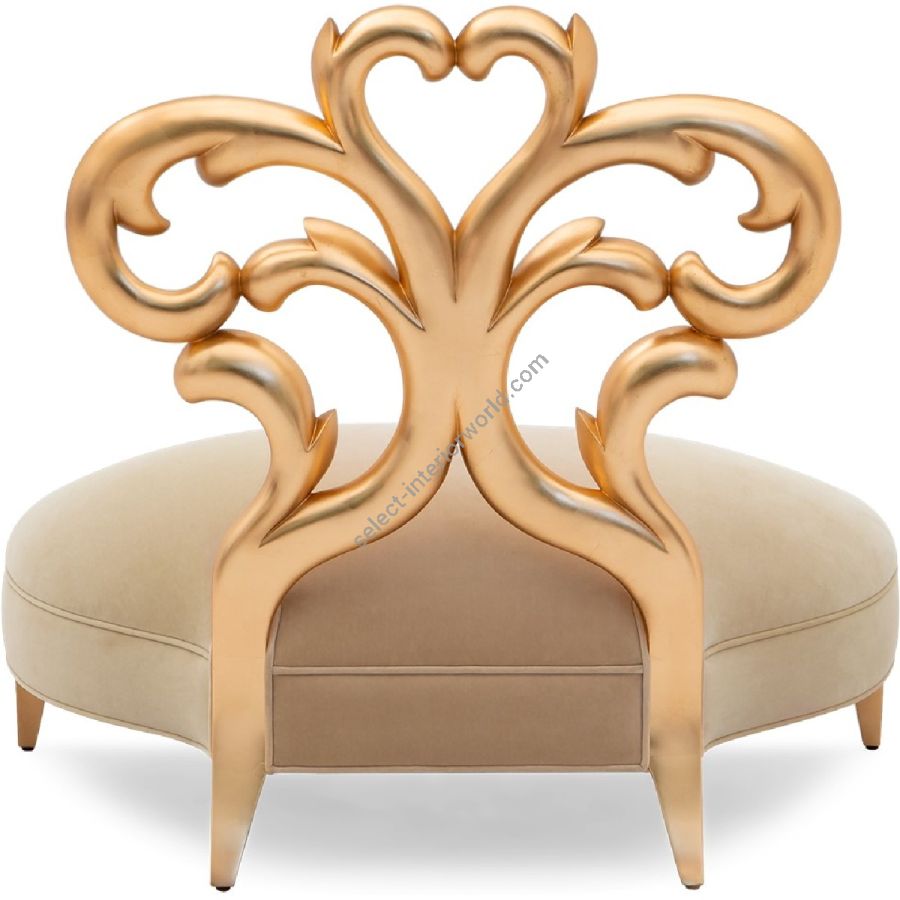 A stunning wide-seat occasional chair with a graceful hand-carved back-rest incorporating a heart motif.