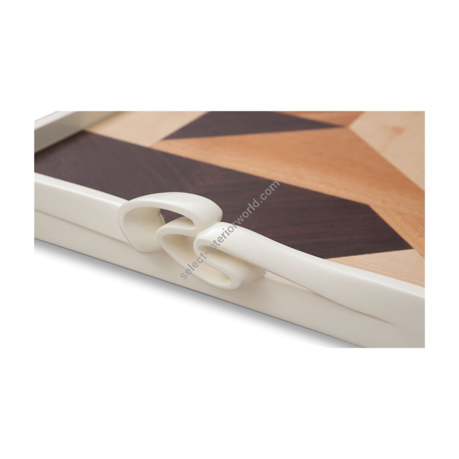 Defined by bold geometry, this mahogany tray features a dynamic veneer pattern and hand-carved ribbon handles. Its striking angular form is available in a range of rich tone combinations and two sizes—ideal for serving, styling, or display.