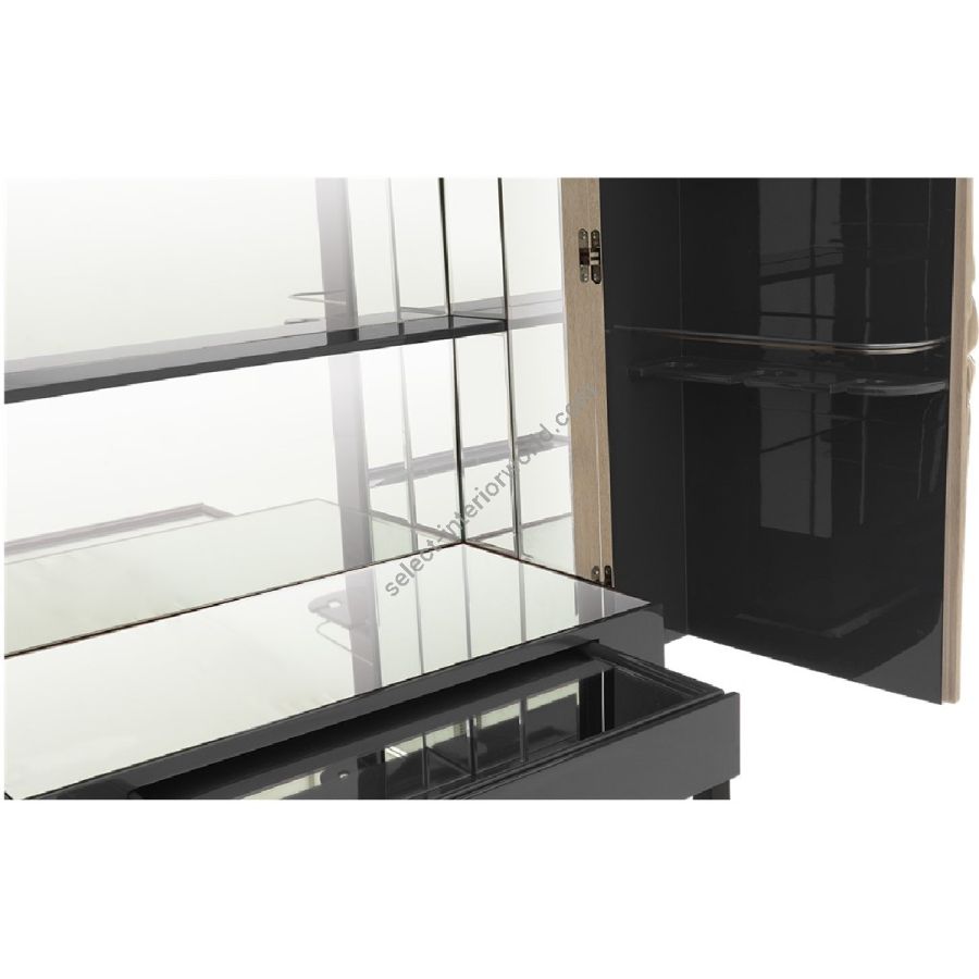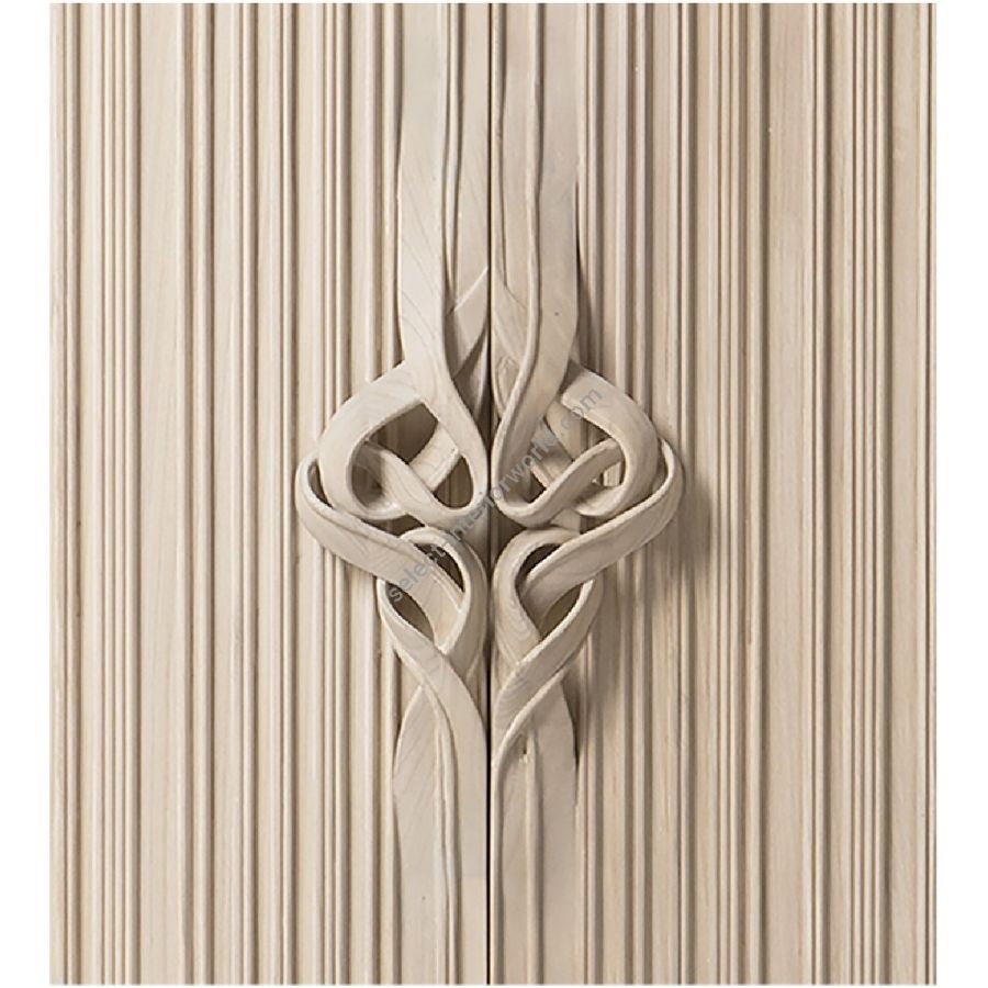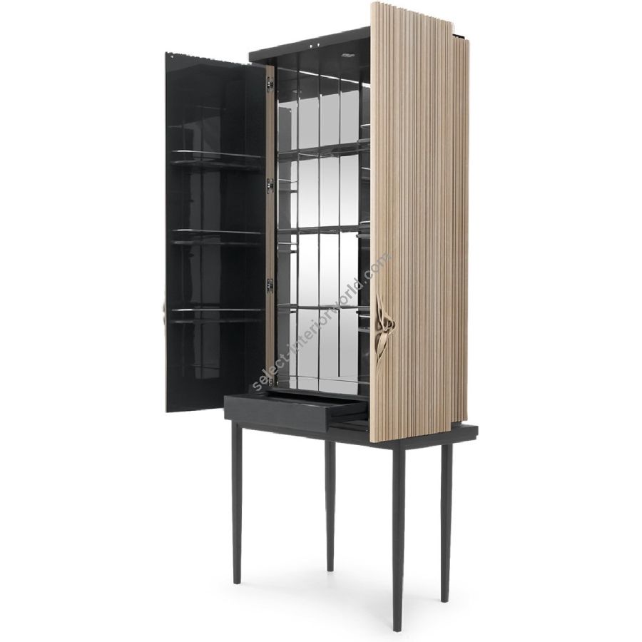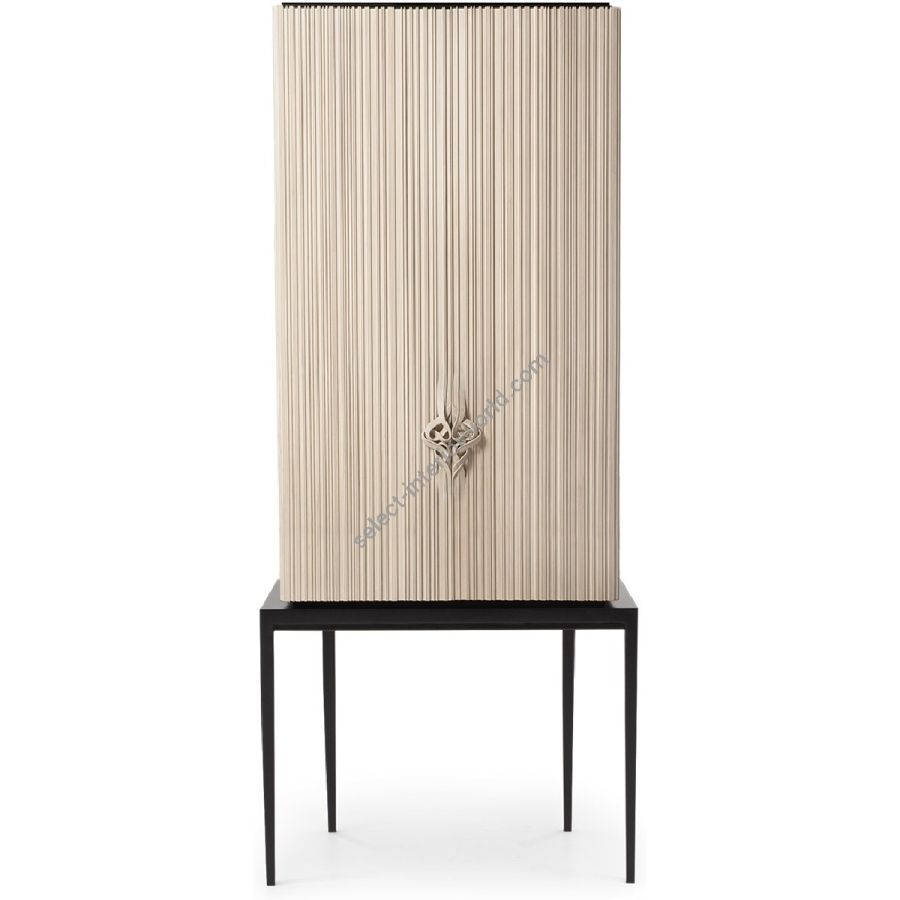 A sleek design with intricately carved reeded doors, accented by the CG signature knot, this tall bar cabinet features shelving for wine, spirits and stemware storage. The cabinet is perched atop metal 'stiletto' supports. Also available in a larger version (88-0010).