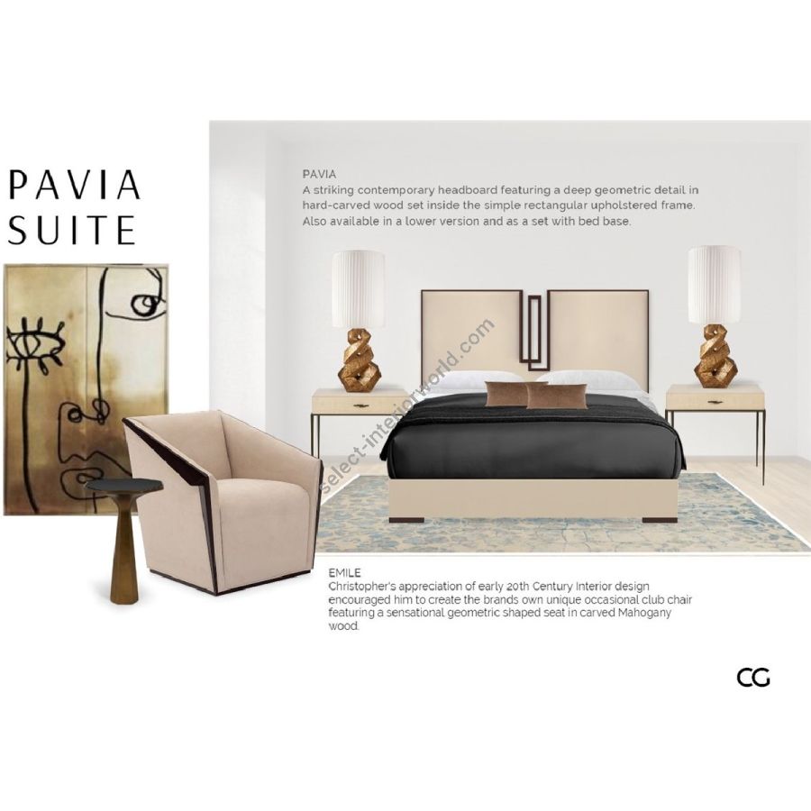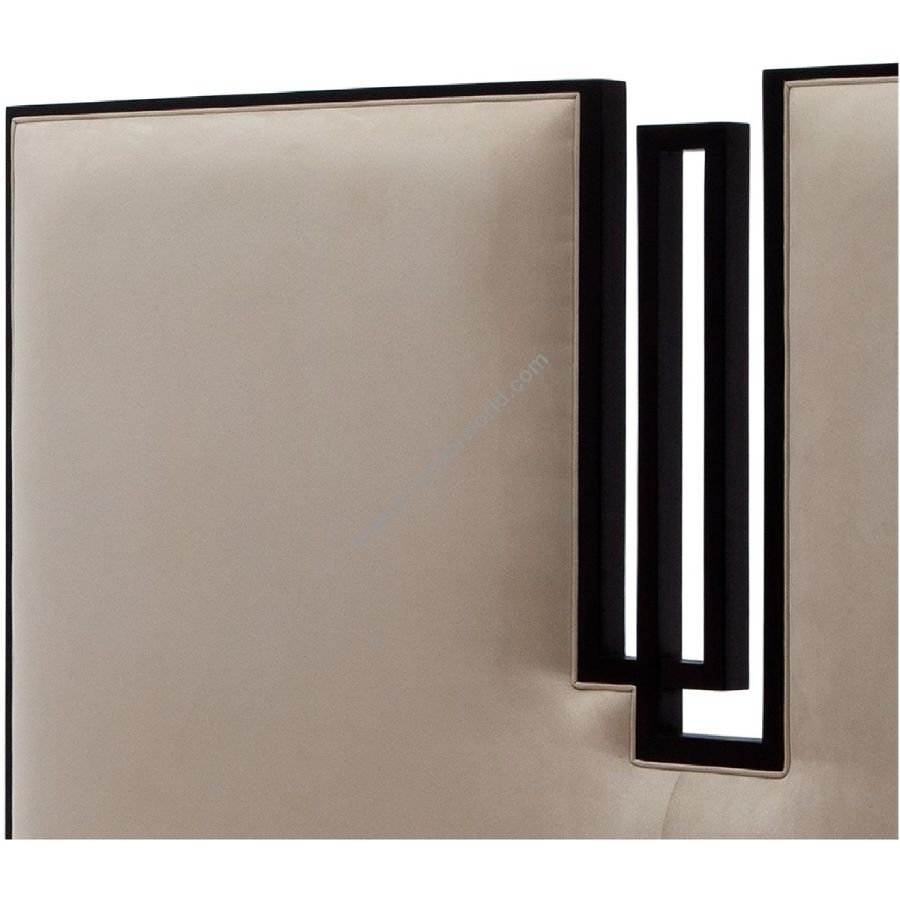 A striking contemporary headboard and bed base set. The headboard features a deep geometric detail in hand-carved detail set inside the simple rectangular upholstered frame and the bed base is accented with hand carved square feet.