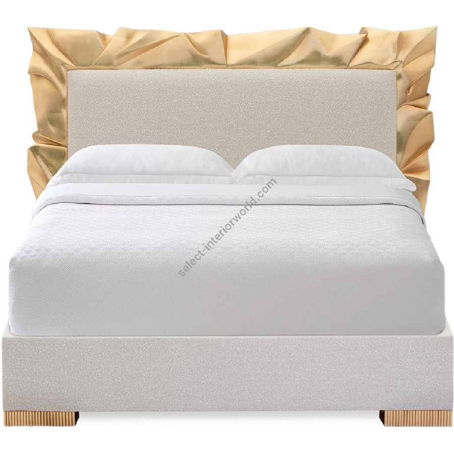A showstopping headboard and bed base set. The headboard features a crumpled rectangular design in hand-carved wood framing an upholstered headboard, and the divan has squared wood feet.