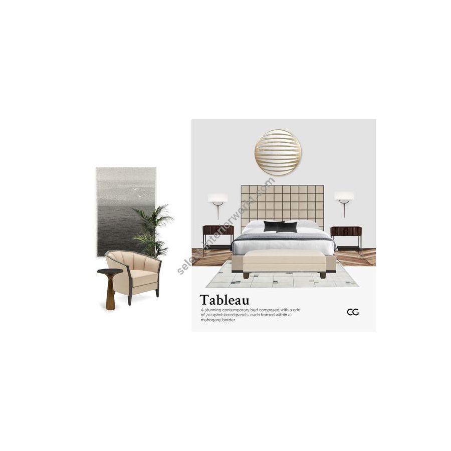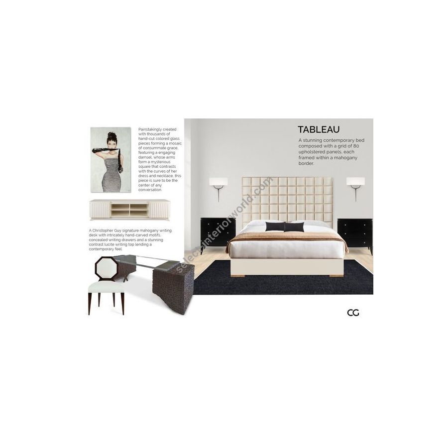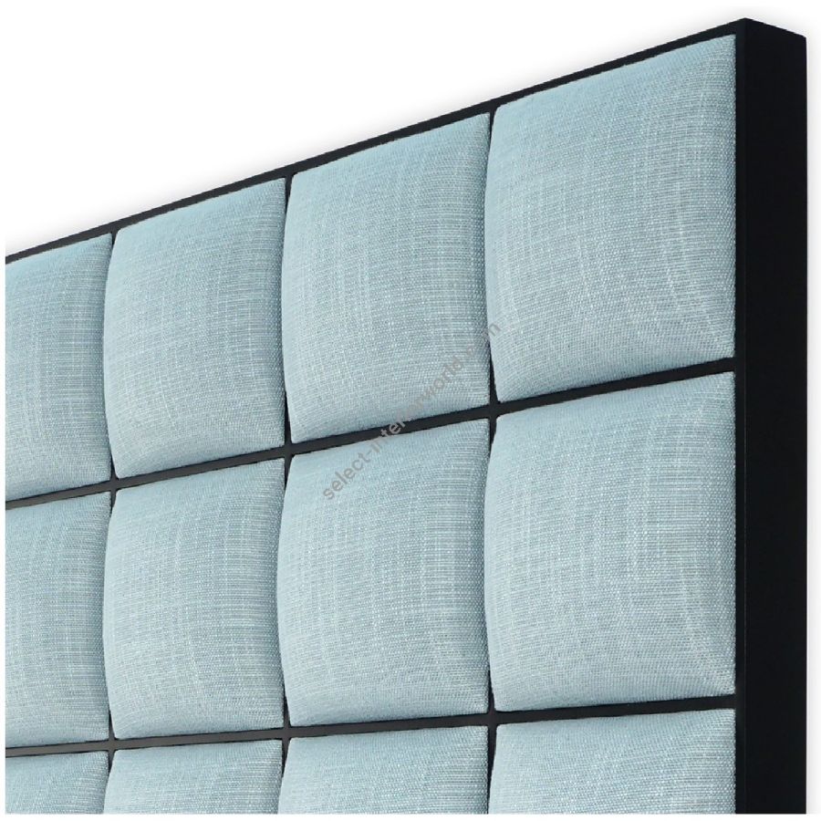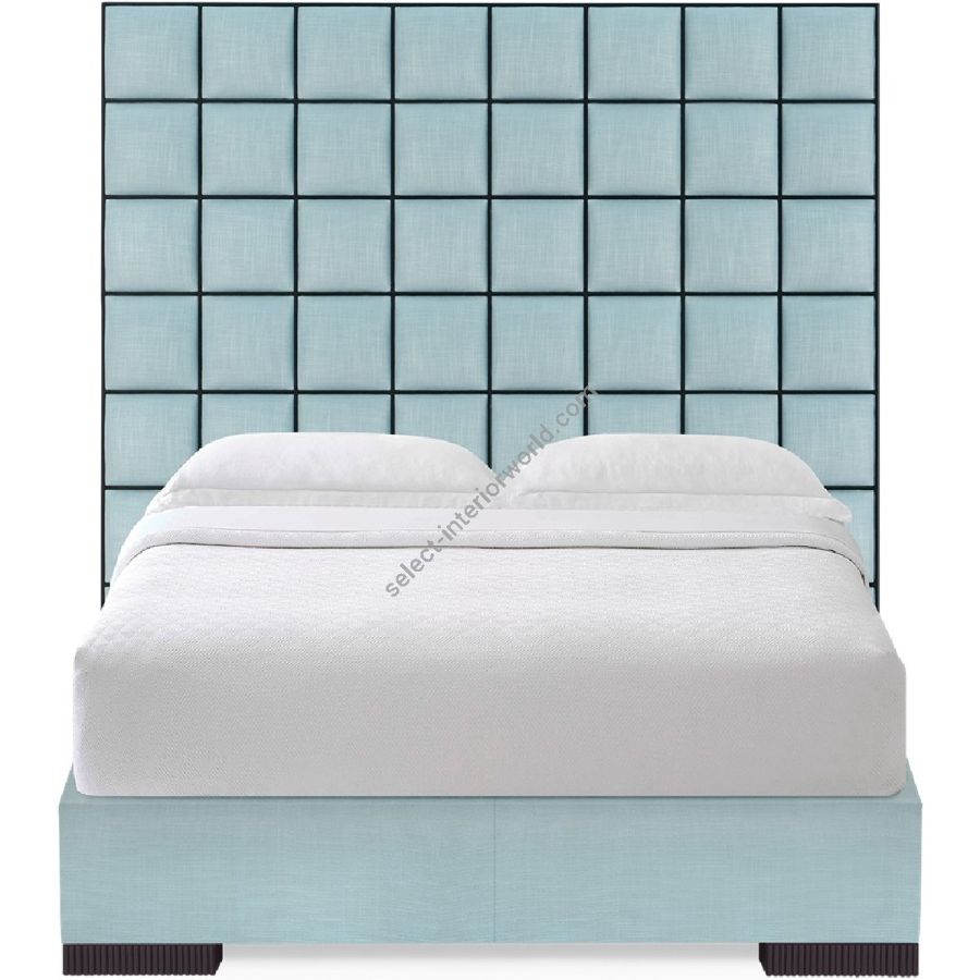 A stunning contemporary bed composed with a grid of 80 upholstered panels, each framed within a mahogany border.