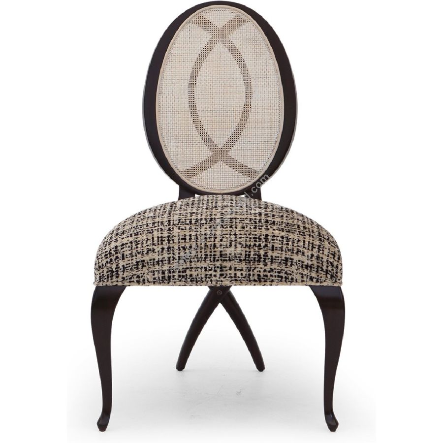 The beauty and complexity of its sunken rattan backrest is further detailed by the flowing lines of the rear facing 'Chris-Cross' legs on this magnificent dining chair.