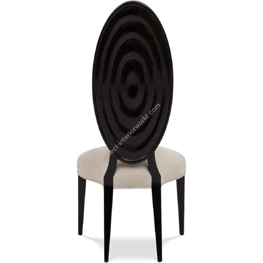 A striking dining chair featuring a tall oval upholstered backrest with the rear exquisitely hand carved into concentric circles. The back is supported on pivoted, slanting straight legs for an elegant profile.