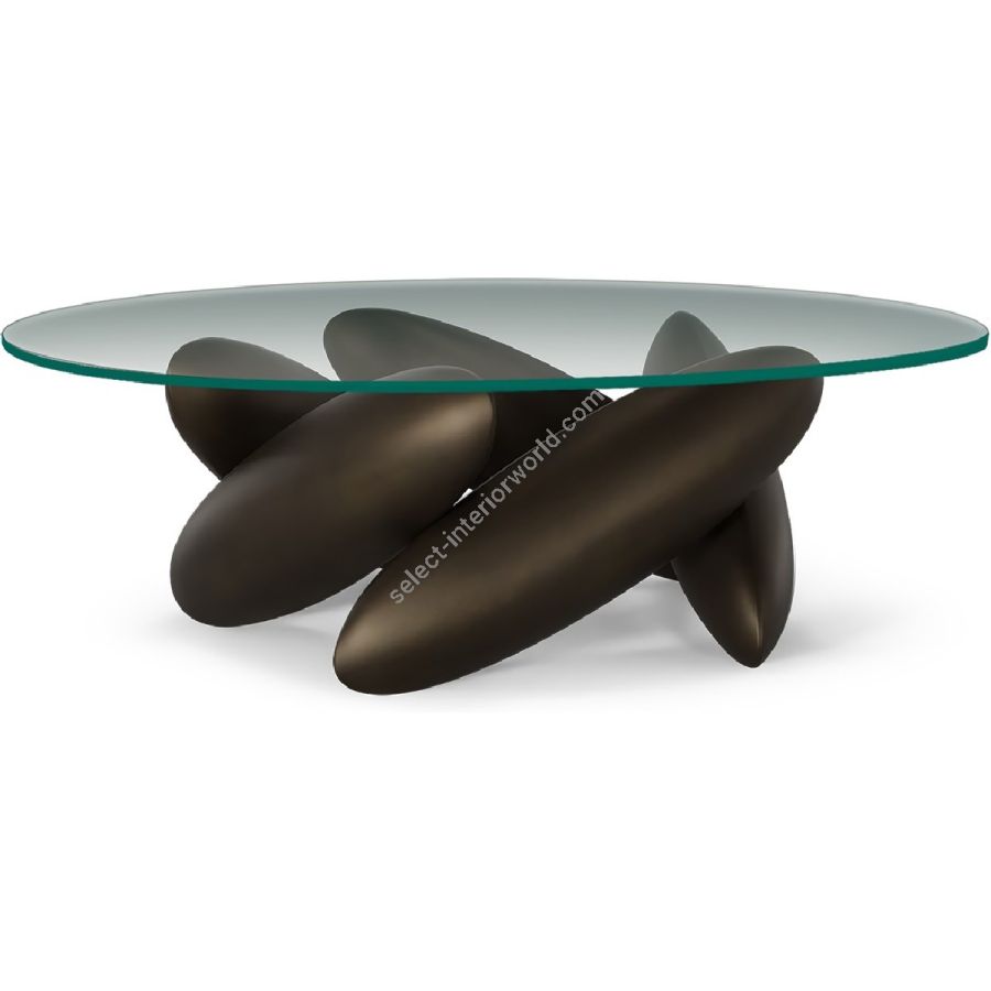 An extraordinary coffee table with hand carved wood seed shapes forming a circular base, topped with round clear glass, allowing the base to be viewed from all angles.