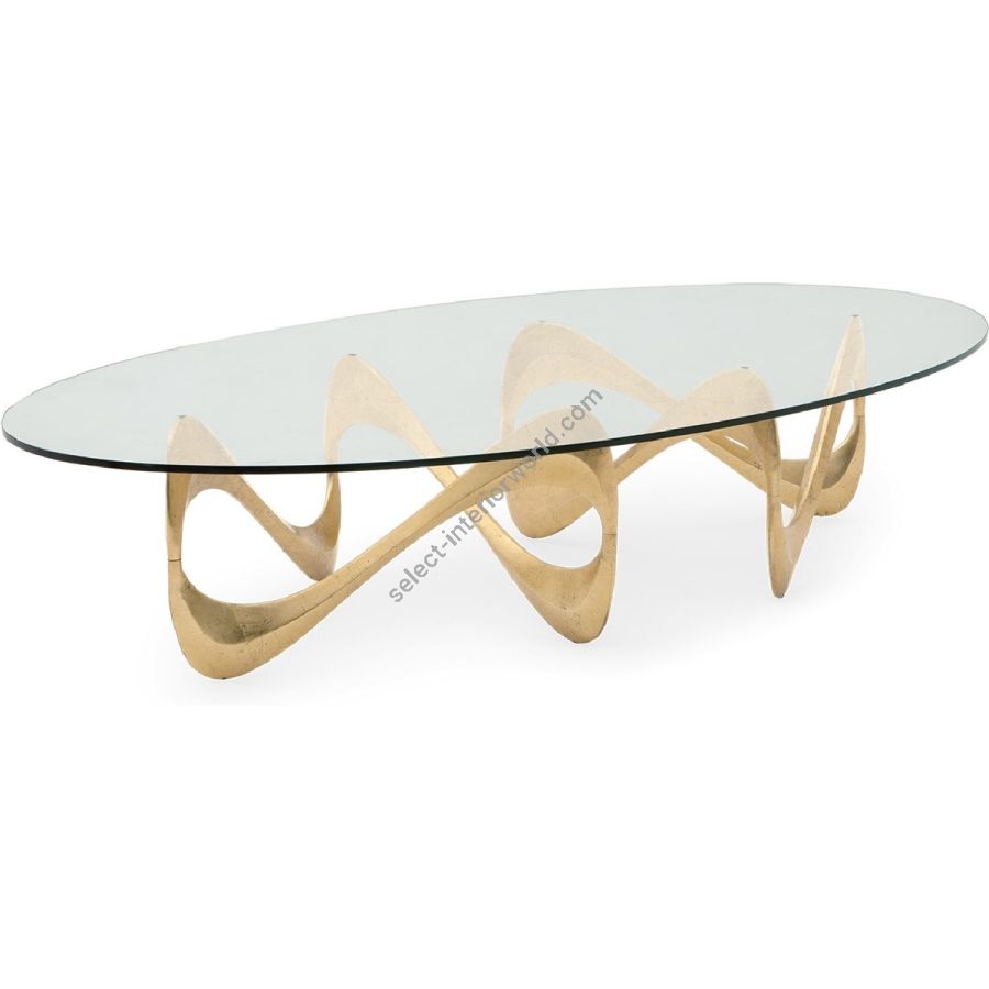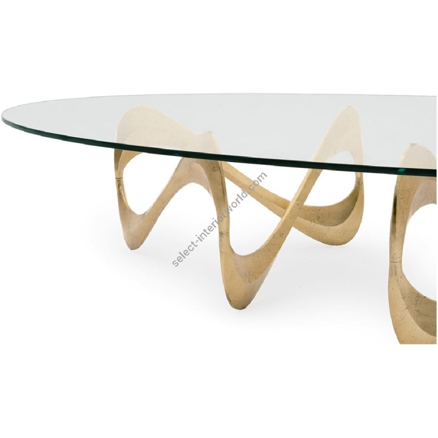 The alluring curves of the double supports of this dramatic coffee table are complemented by a beautifully simple transparent oval tempered glass top.