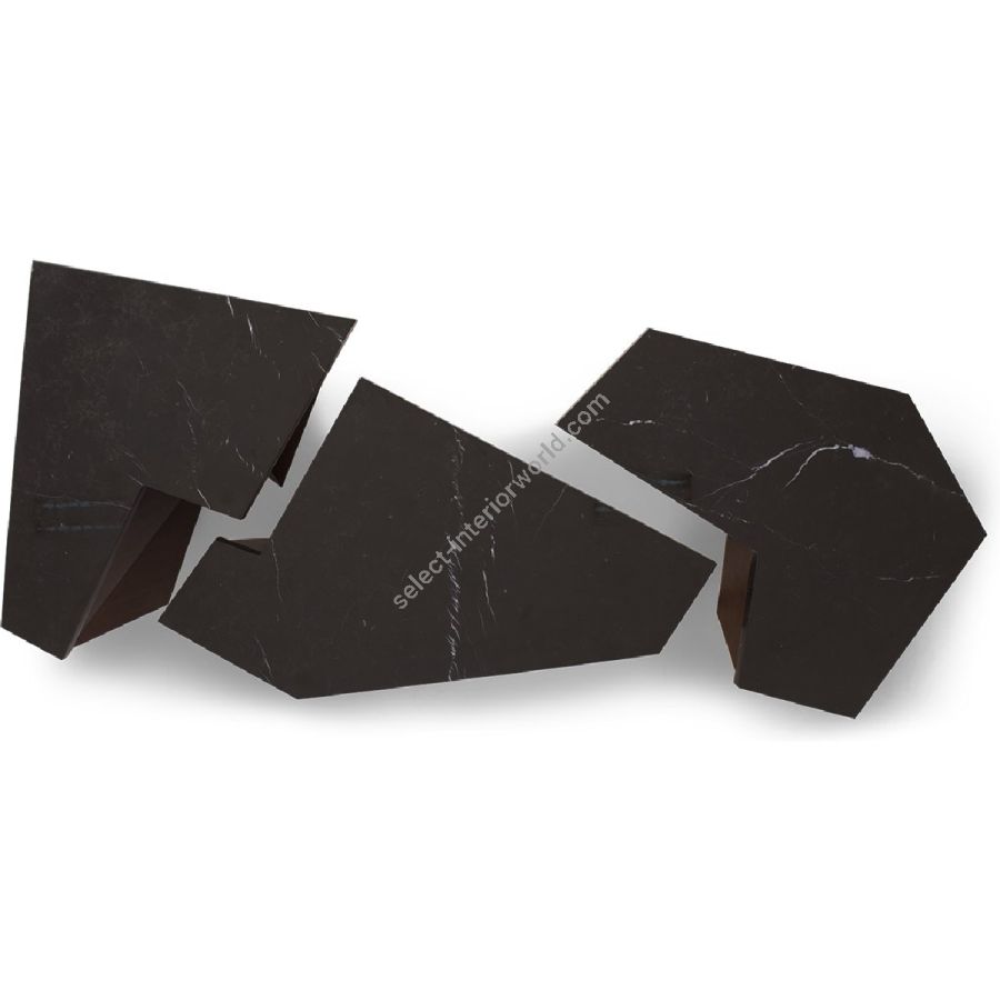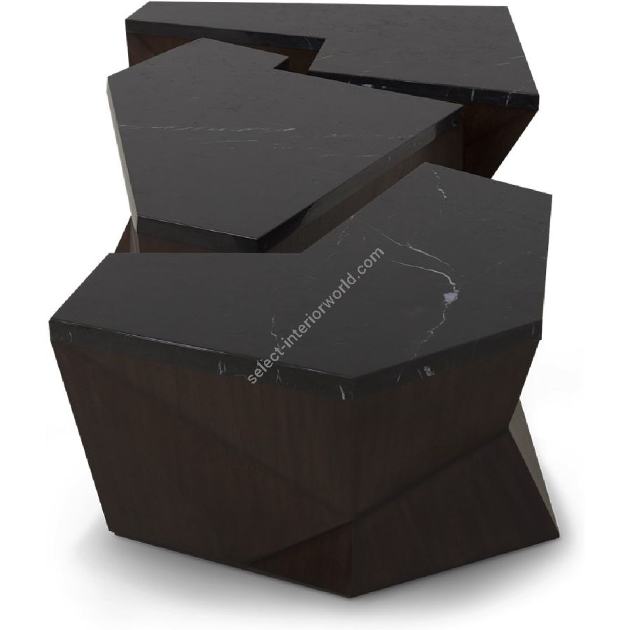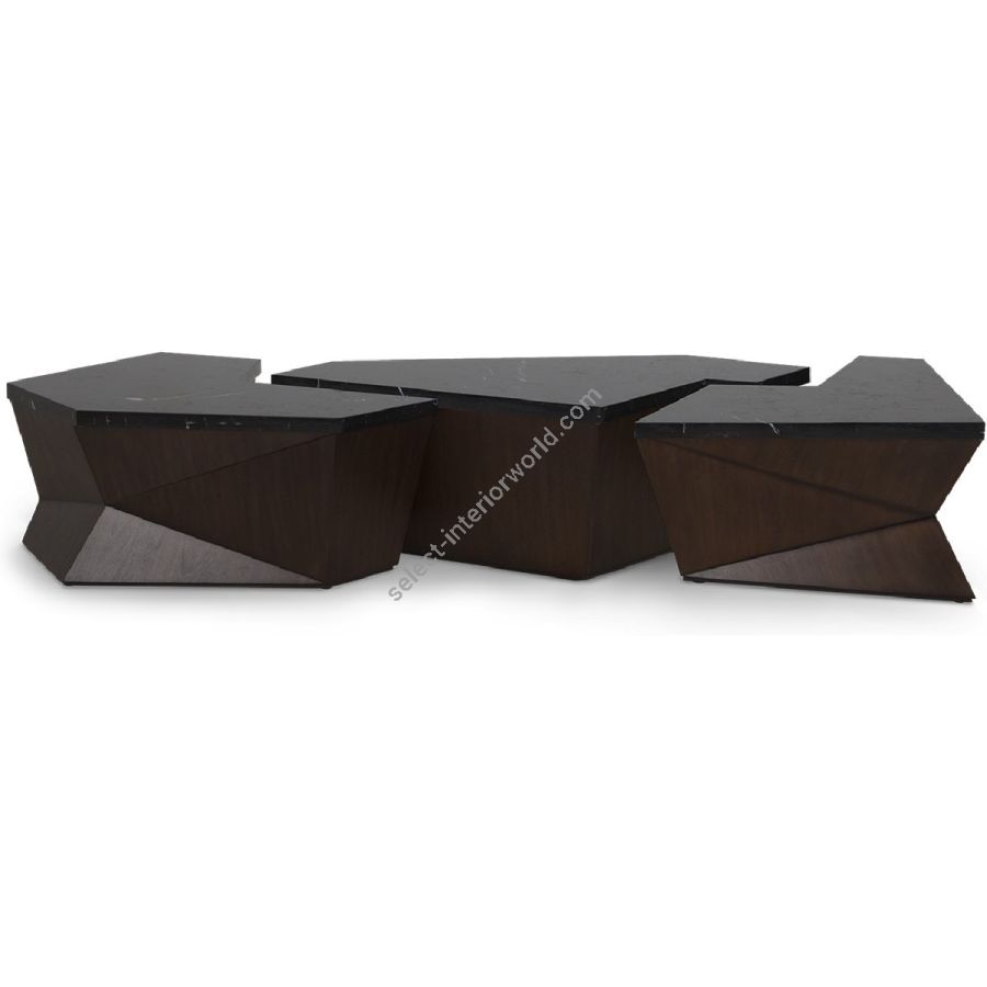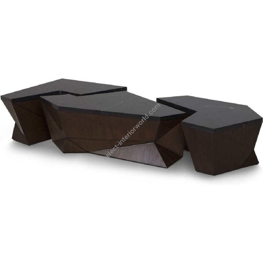 Monumental coffee table design featuring three individual geometric sections, topped with marble. The three elements can be aligned as shown or used independently. A truly spectacular set piece!