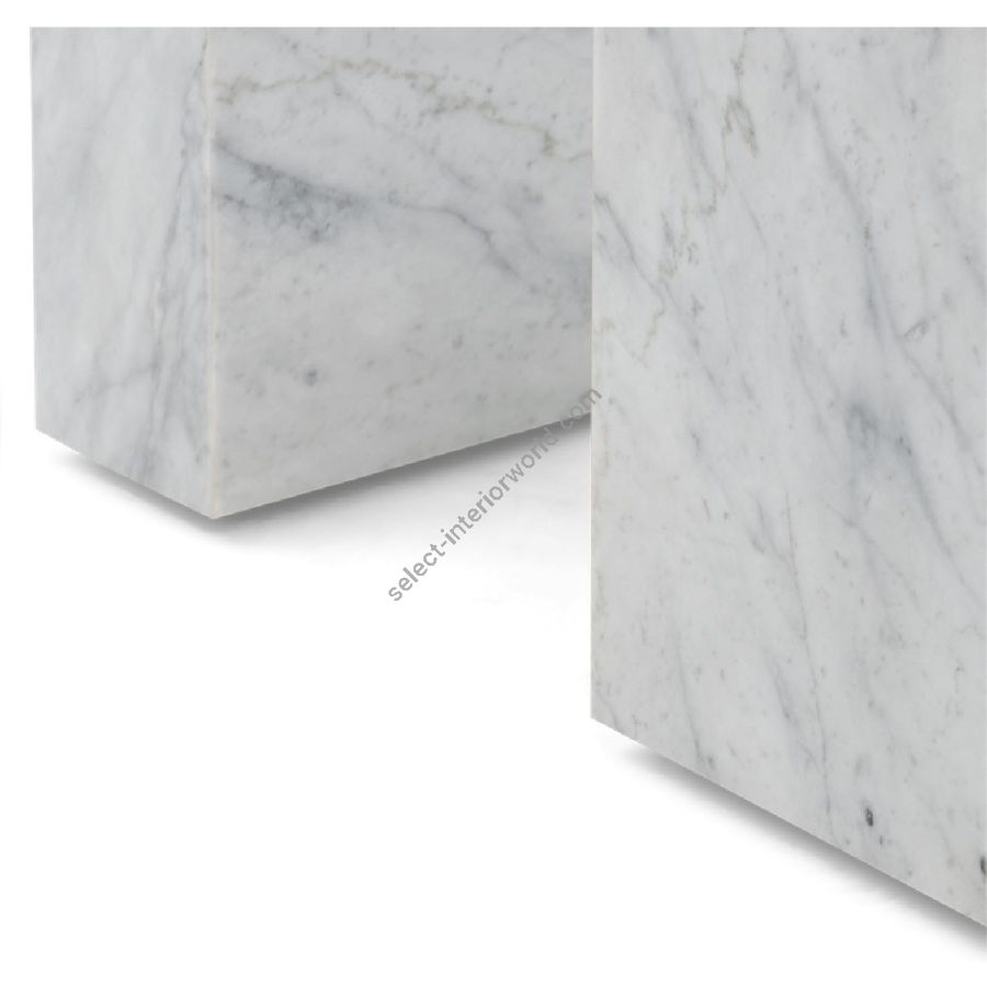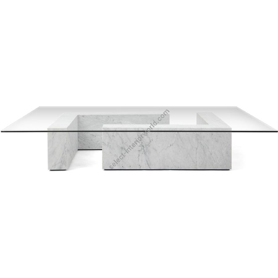 A sleek Modernist coffee table featuring two L-shaped white Carrara marble blocks as the base, with a clear glass top. Simplicity and stylishness to suit any contemporary interior.