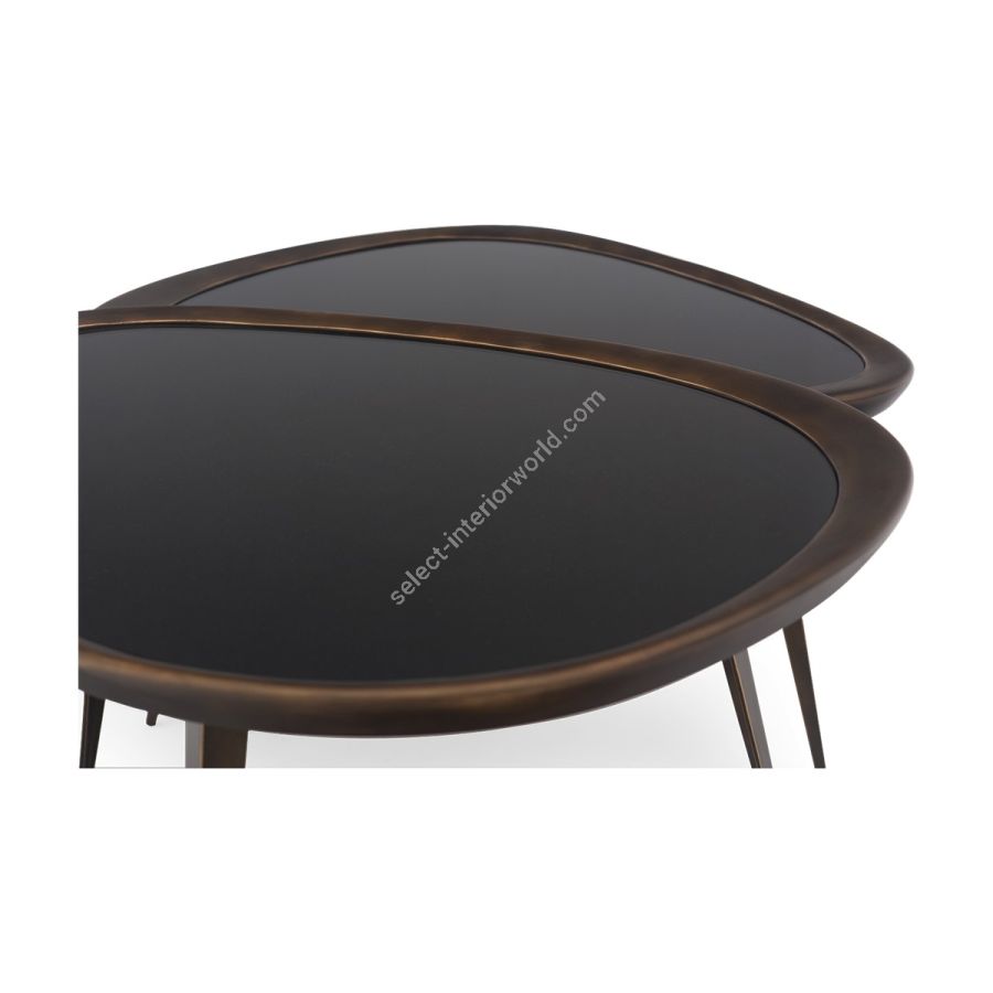 Inspired by classic sixties style furnishings, this charming nest of three tables features metal legs in either bronzage or gold, and elliptical tops in black glass with a wooden frame.