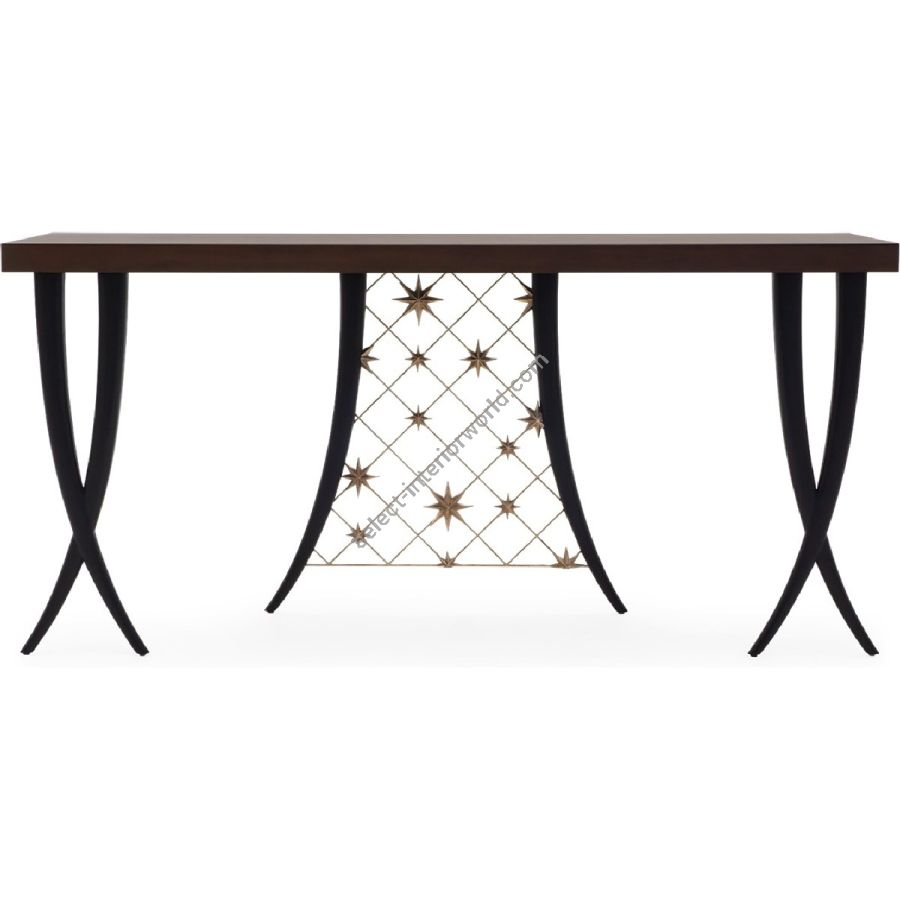 The unique Chris-cross signature legs are central to the design of this magnificent hand-carved console table, crafted from solid and veneered mahogany, with gilded metal mesh accents.