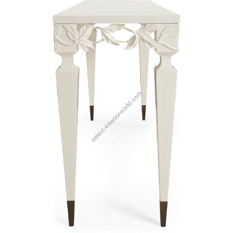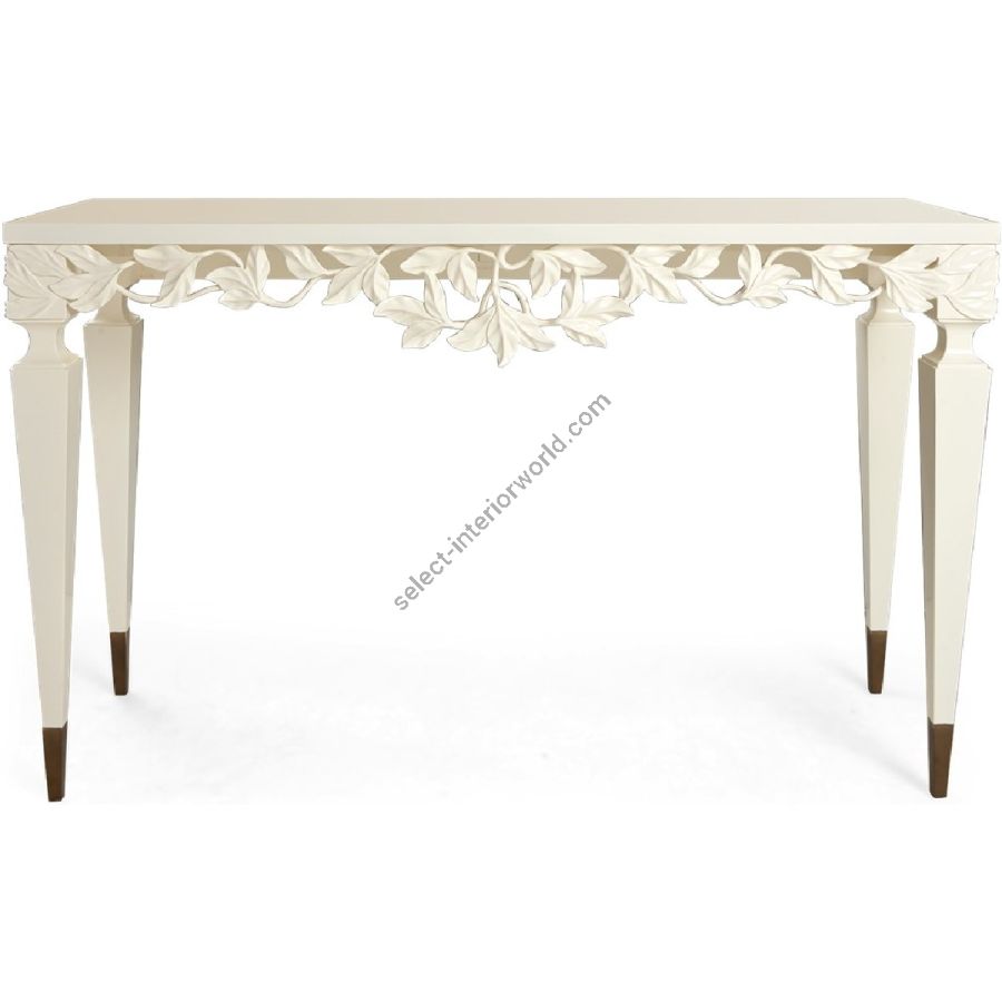 An elegant console table with exquisitely detailed tapering legs, metal cap and a hand-carved mahogany frame richly decorated in a vine leaf motif. A simple mahogany top completes the piece.