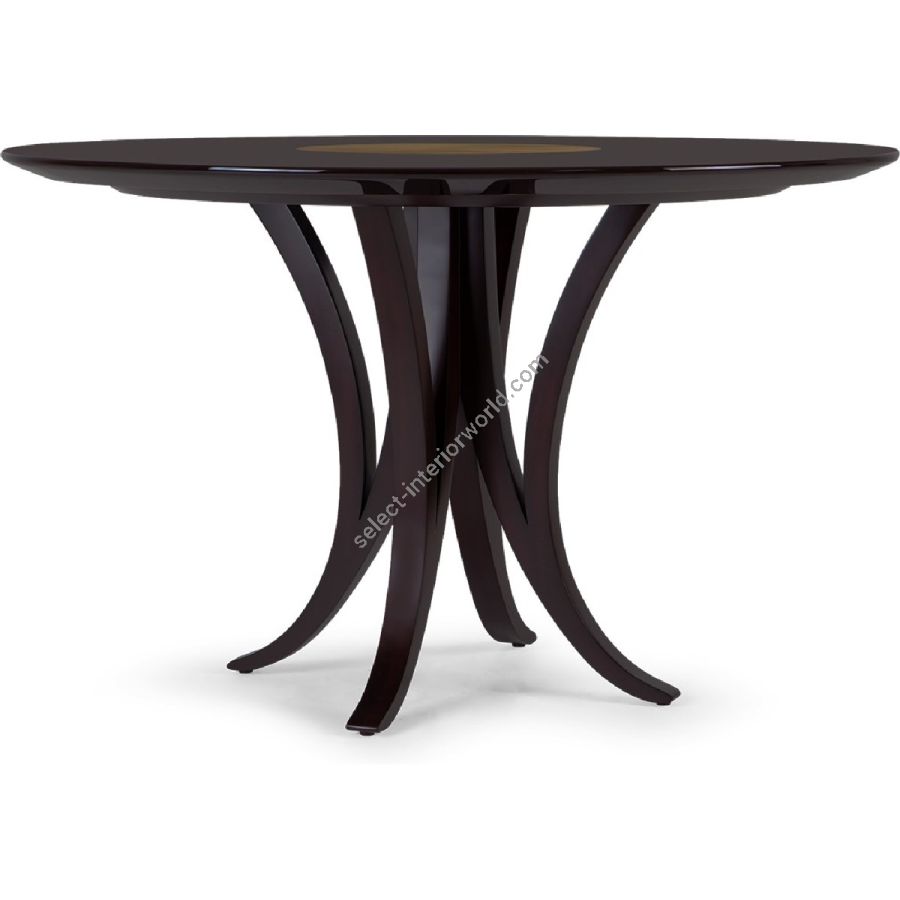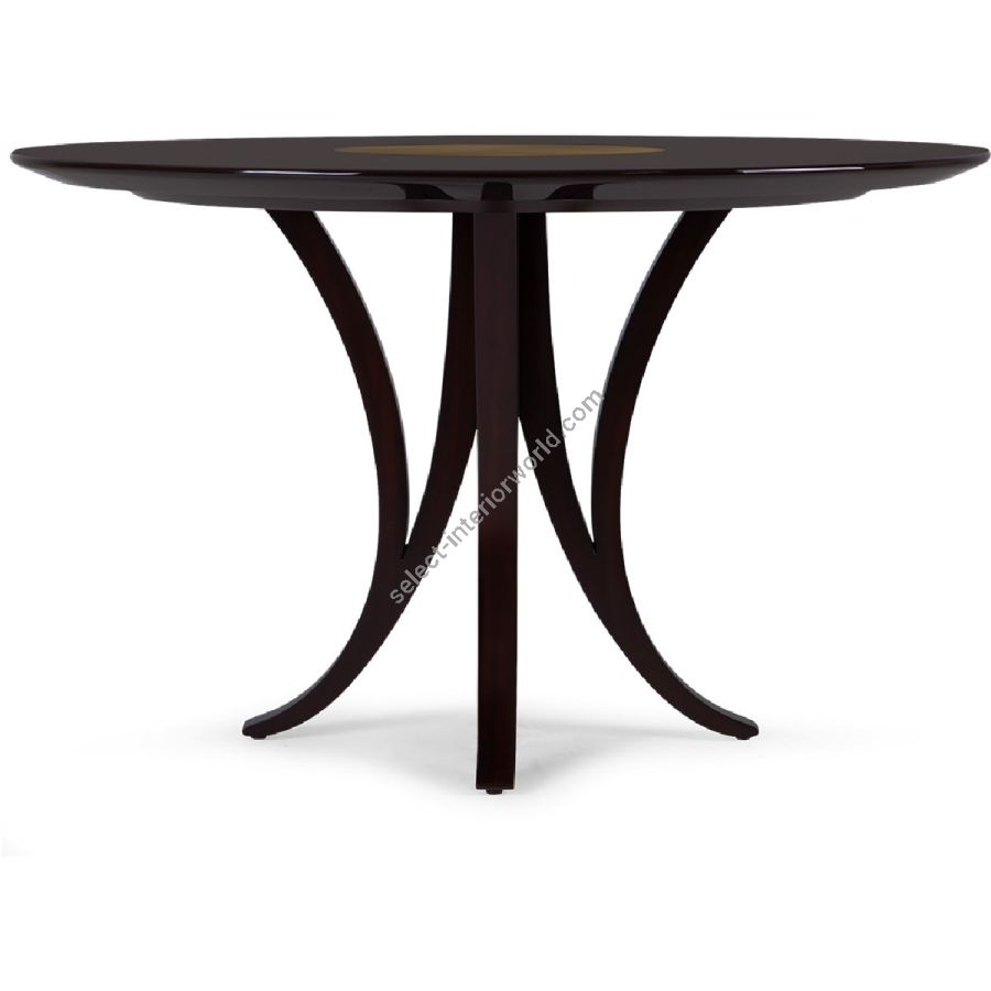 Exquisite round dining table supported by four curvaceous mahogany legs. The veneered top is further highlighted with a weathered flush mounted brass center-plate.