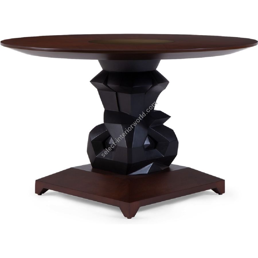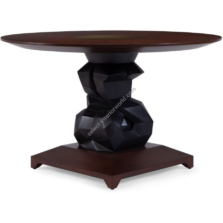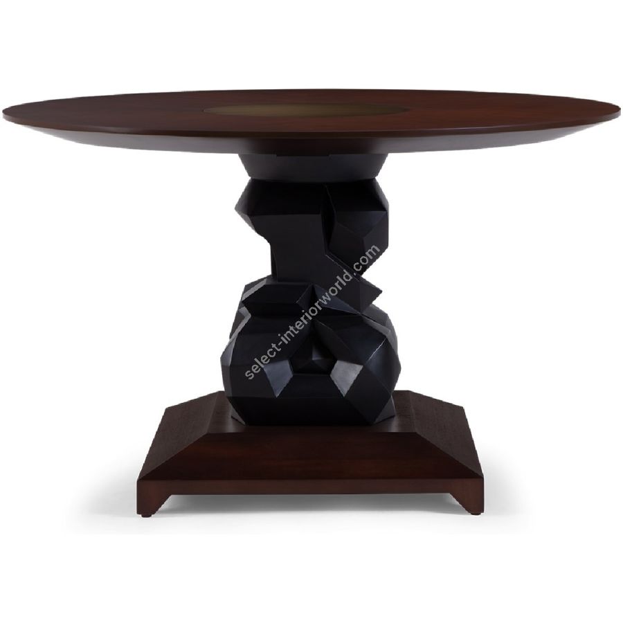 An imposing circular dining table design with hand-sculpted mahogany bases crafted into polyhedron shapes for a spectacular statement piece. The tabletop is expertly joined as four quarters, displaying the beauty of the wood grain.