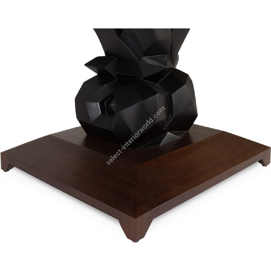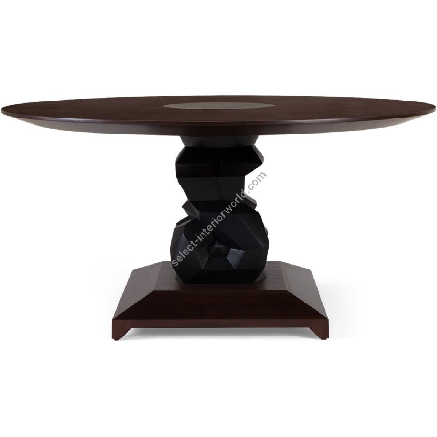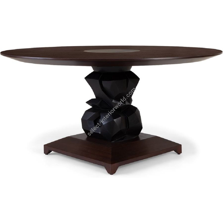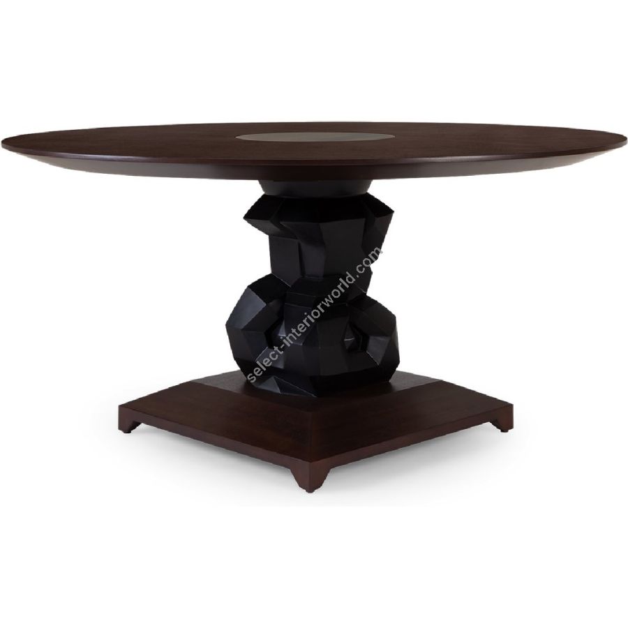 An imposing circular dining table design with hand-sculpted mahogany bases crafted into polyhedron shapes for a spectacular statement piece. The tabletop is expertly joined as four quarters, displaying the beauty of the wood grain.