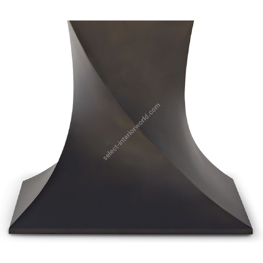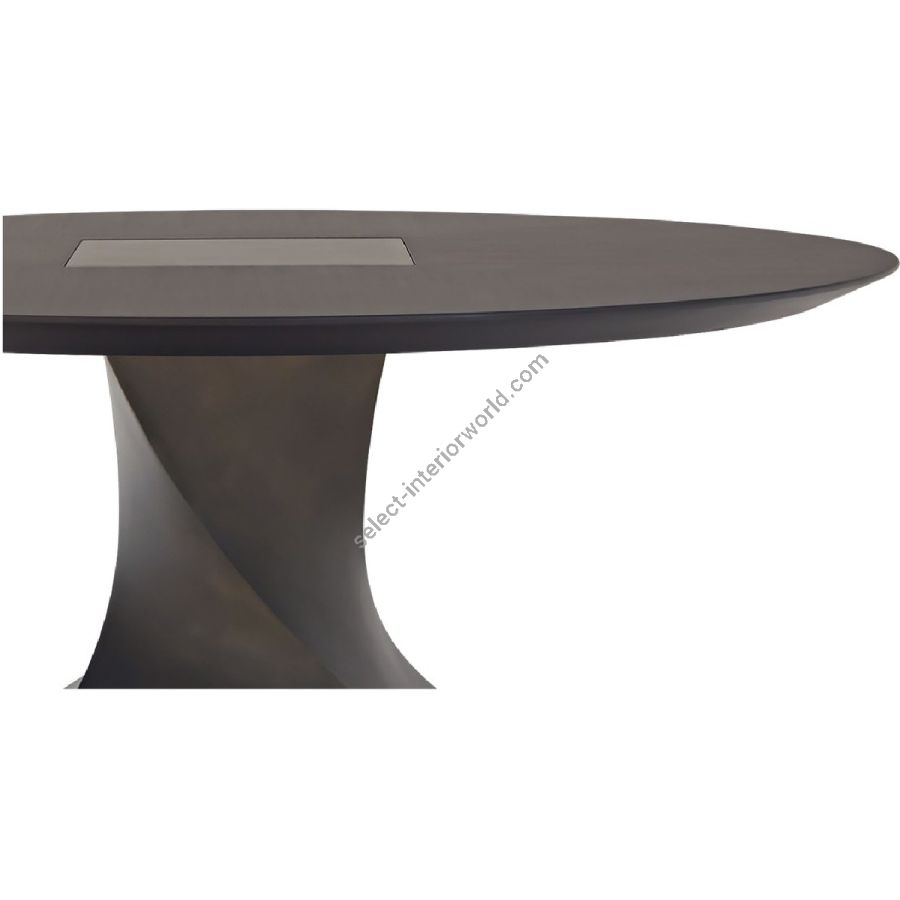Contemporary living with a twist, this circular dining table features a twisted pedestal that protrudes through the veneered surface. The chiseled base is offered in a fabulous bronzed finish.