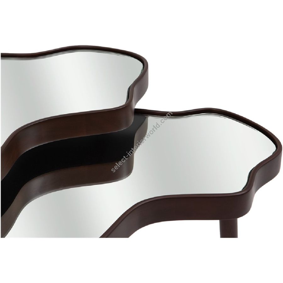 With updated Mid-century styling, this charming nest of two tables features irregular organic shaped tops on classic 60s tripod wood bases. The tops can be either leather or bevel mirror, both encased in hand carved wood.