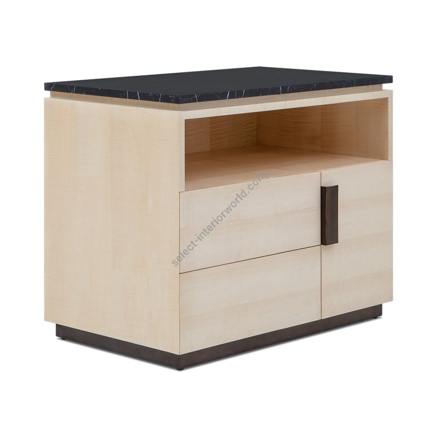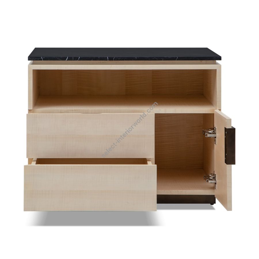 A stunning nightstand with contemporary styling. Hand crafted with an asymmetrical side-opening door, two drawers and a backlit shelf compartment, this striking piece also features an inset base and Nero Marquina Marble top.