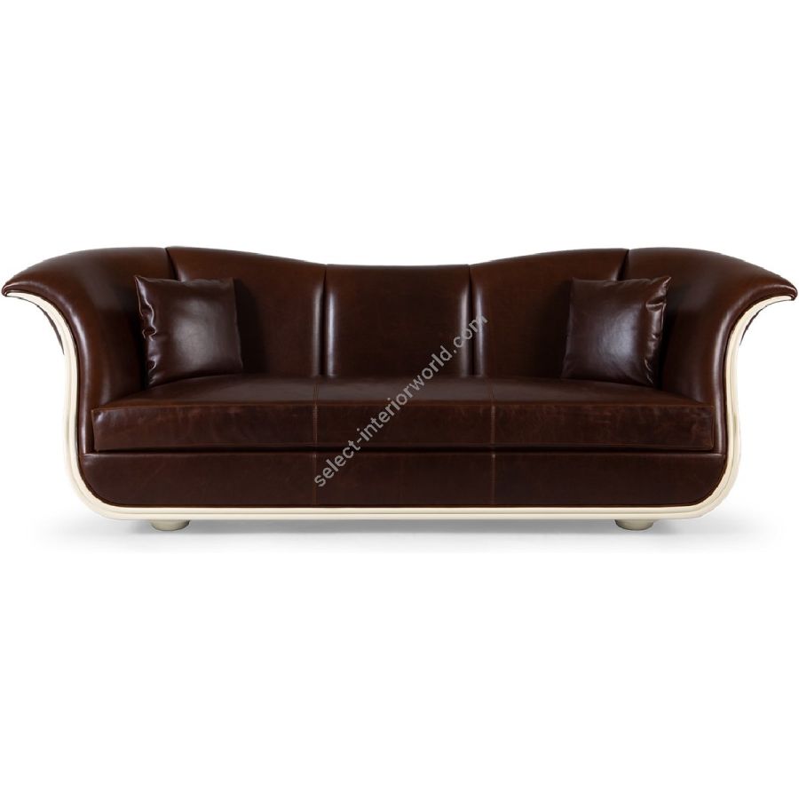 The feminine curves of the back-rest of this elegant two-seater sofa are beautifully highlighted by the richly appointed detailing around the arms and the base. Generous upholstery provides the perfect complement.