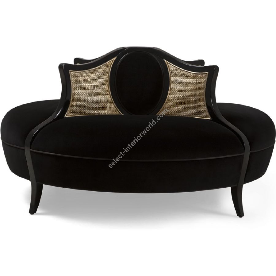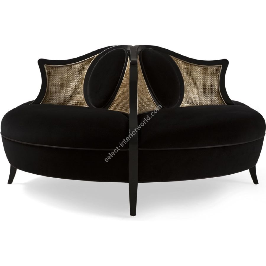 A beautifully stylish conversation seat with sweeping hand-carved wood dividers framing curved rattan, and elegant oval detailing. An outstanding feature piece.