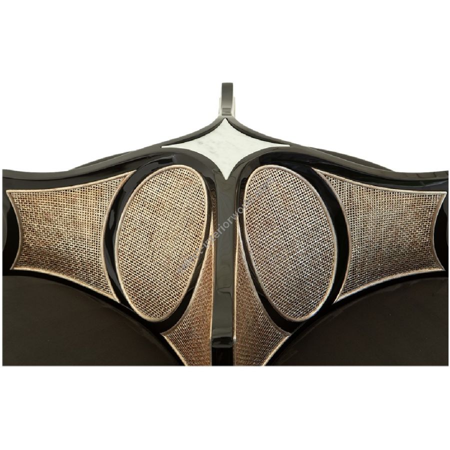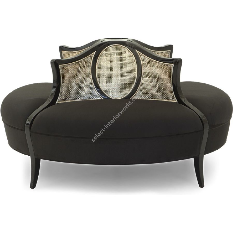 A petite conversation chaise with sweeping curved backs featuring oval detailing in Italian rattan. An outstanding statement piece for an entrance lobby or dressing room. Also available with upholstered back (60-0420)