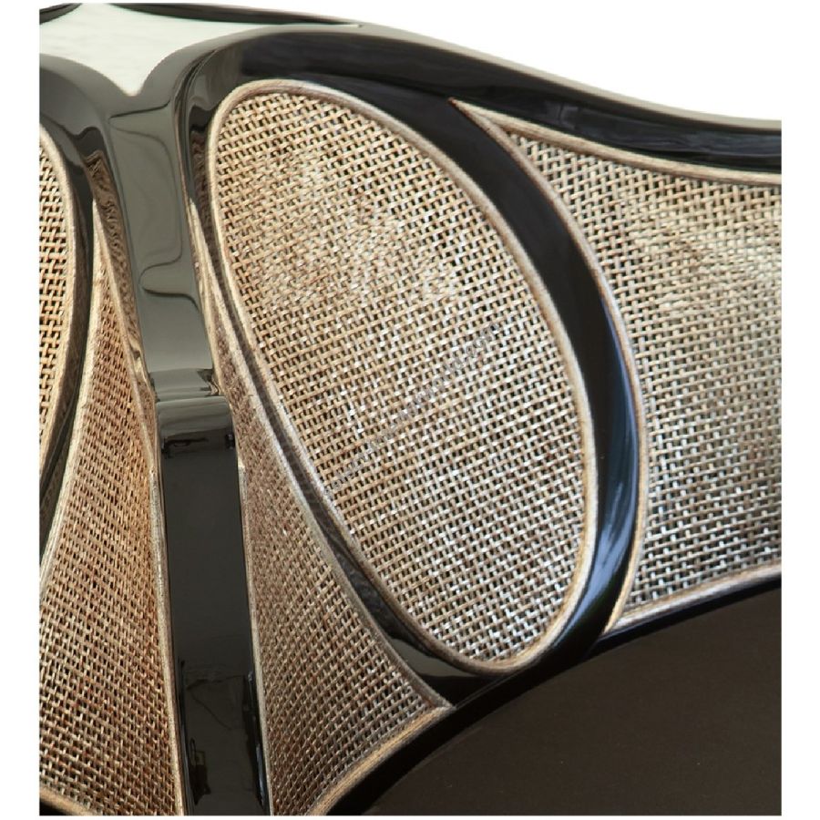 Doweled mortise and tenon frame in solid Mahogany from certified source. Sculptured by our Master-Carvers. Tight seat undersupport with high-density upholstery fill. Hand-woven rattan, available in an array of finishes. Available in a selection of finishes. For residential use only. Commercial use is classified as Special Order Design (SOD), and alternative materials may be required. Contact us for details.