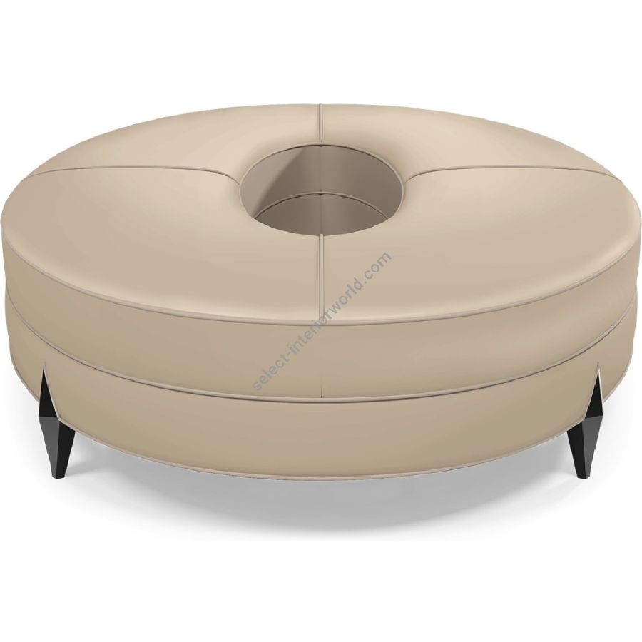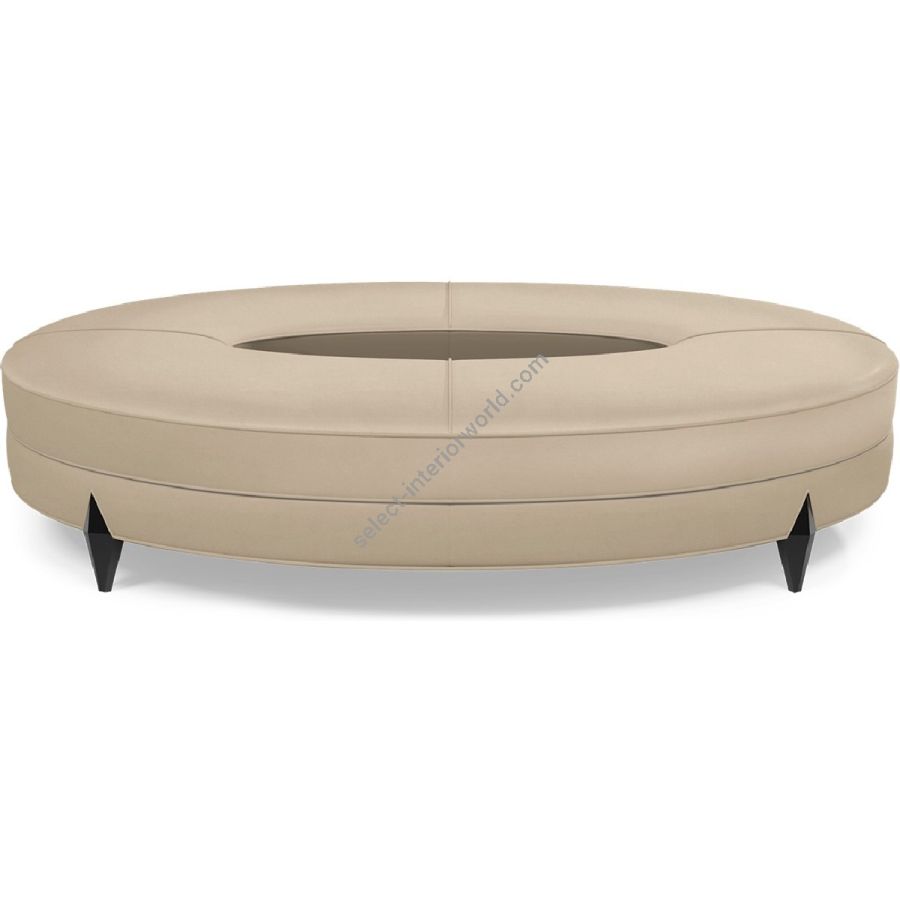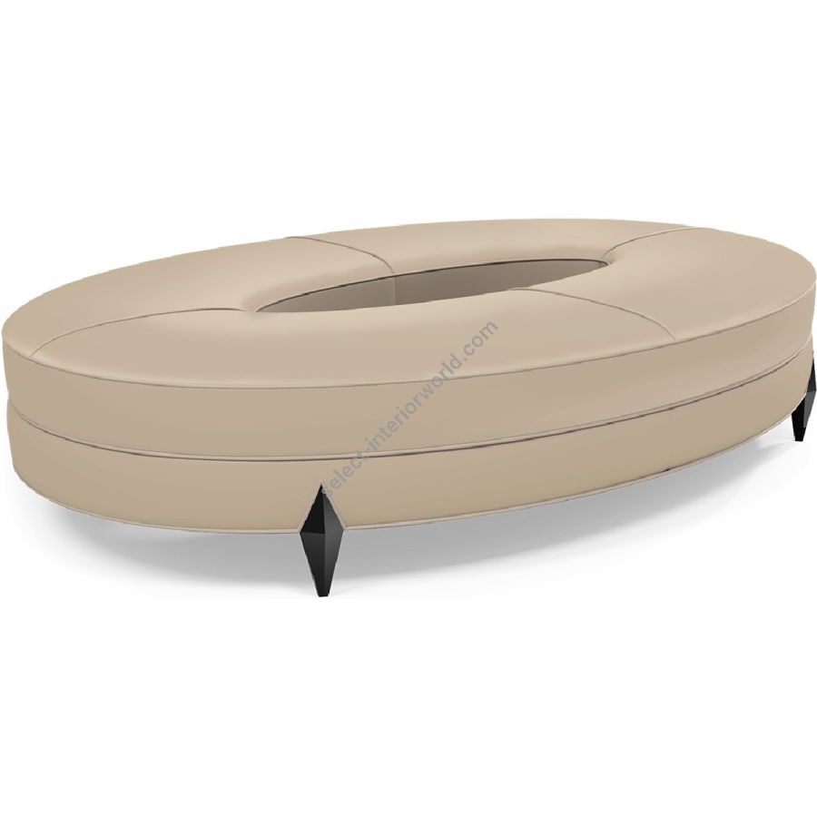 This sumptuous oval ottoman features a central void, enhanced by a set of four angular leg supports circling the outer perimeter.