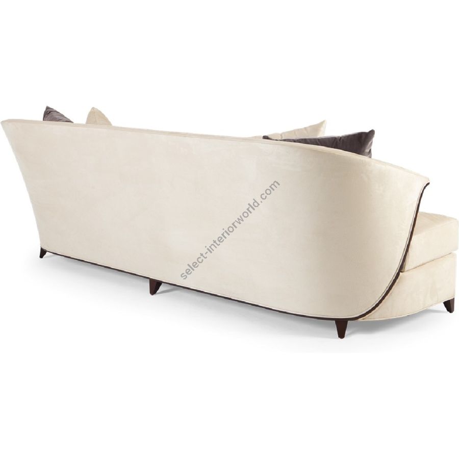 This elegant sofa features a beautiful cape style back framed with mahogany accents. A perfect accent piece combining simplicity and sophistication.
