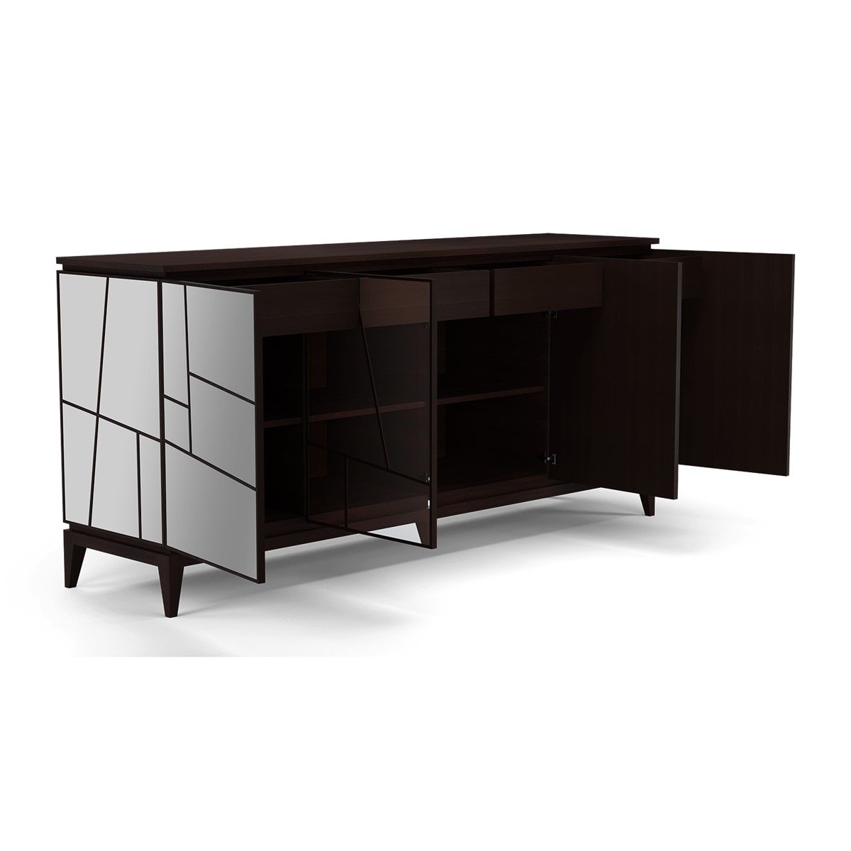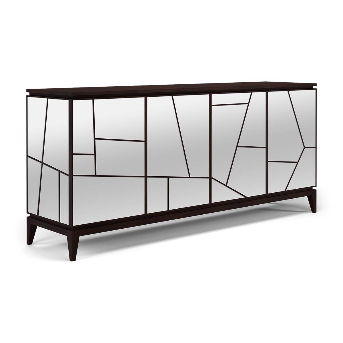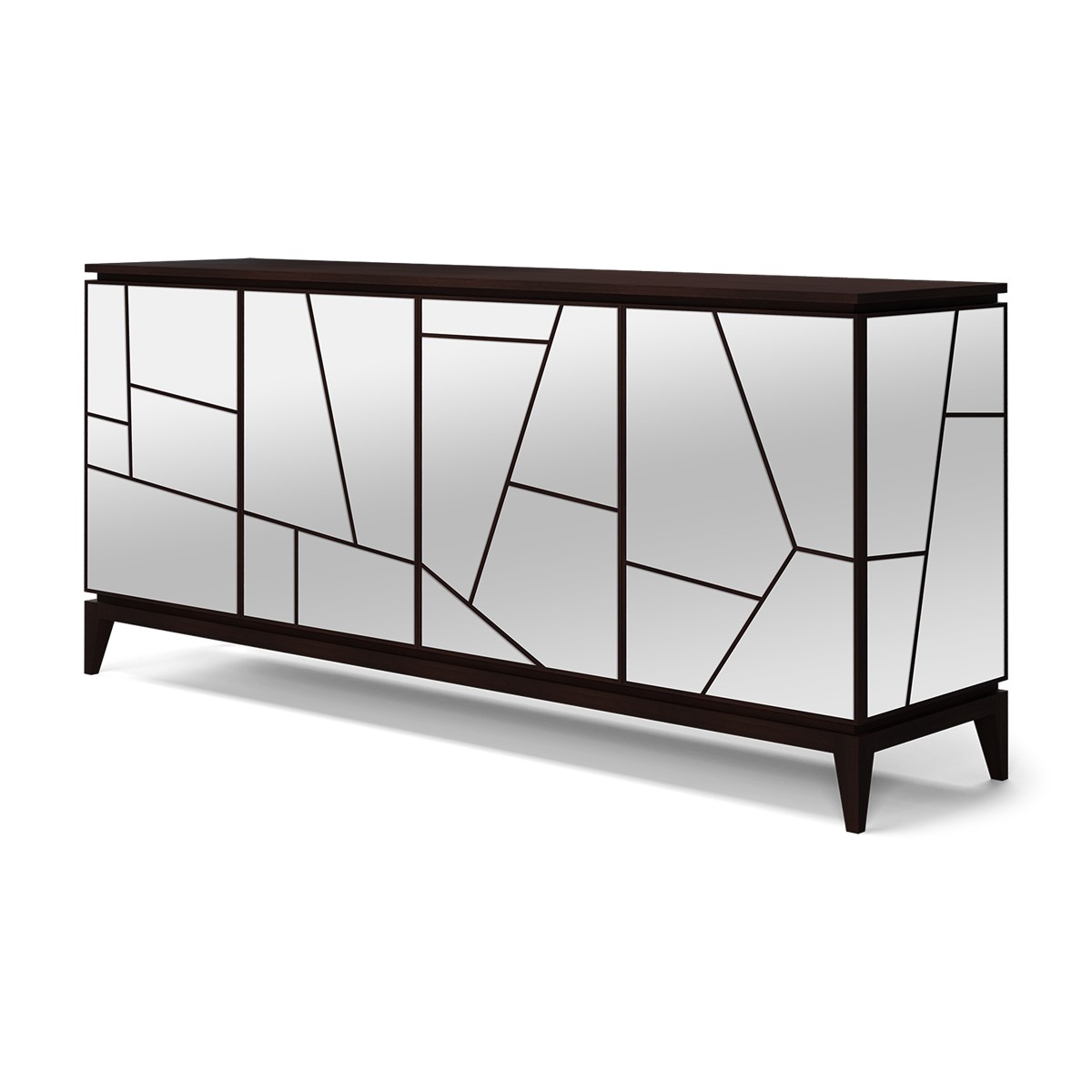 Named after the famous contemporary French architect, this sideboard features four doors, four drawers and eight compartments with adjustable shelves. This striking piece is hand carved in wood on an elegant wood base, and clad in geometric shaped mirror panes. Also available as a nightstand clad in leather panels (84-0061), a nightstand clad in mirror panes (84-0062), and a sideboard clad in leather panels (85-0087).