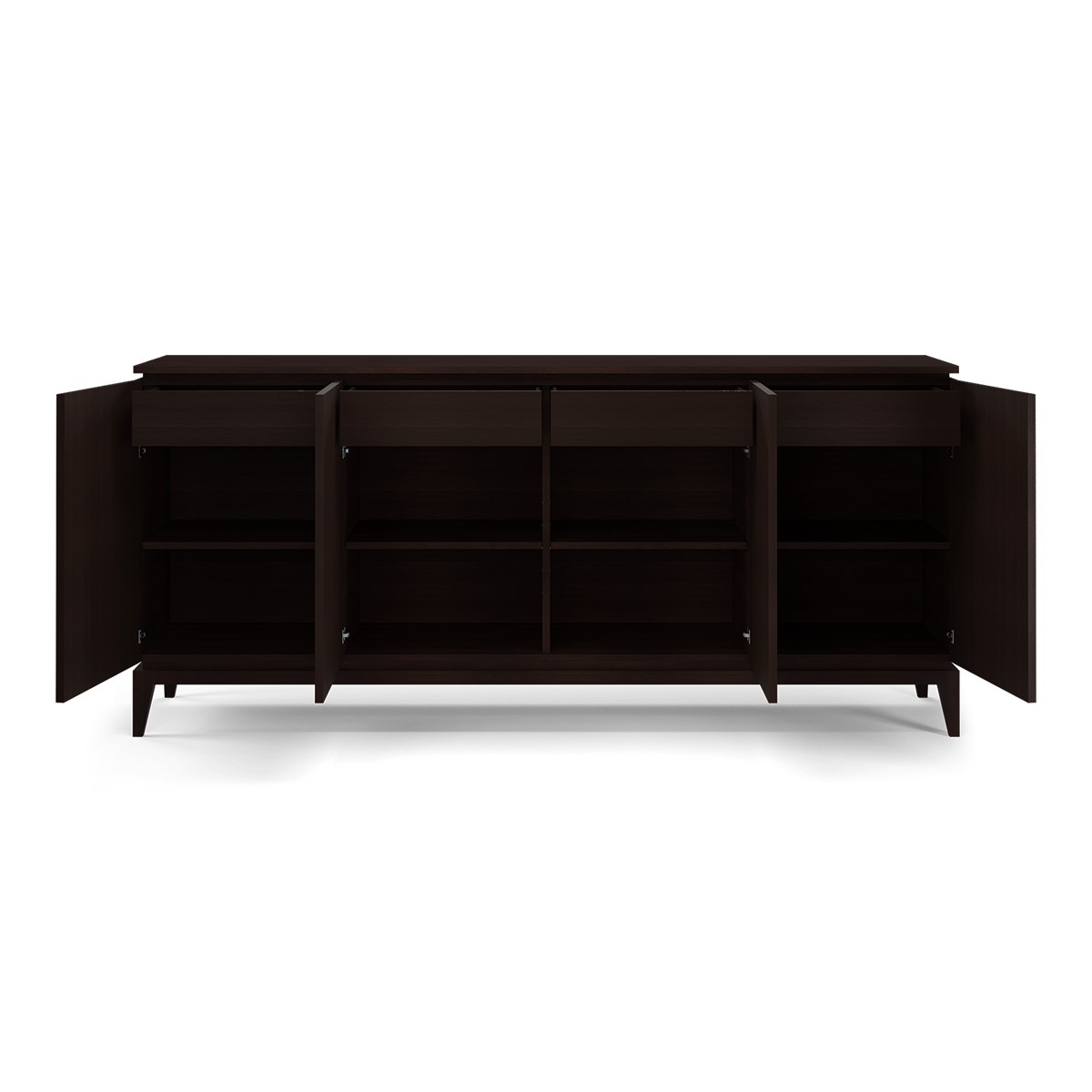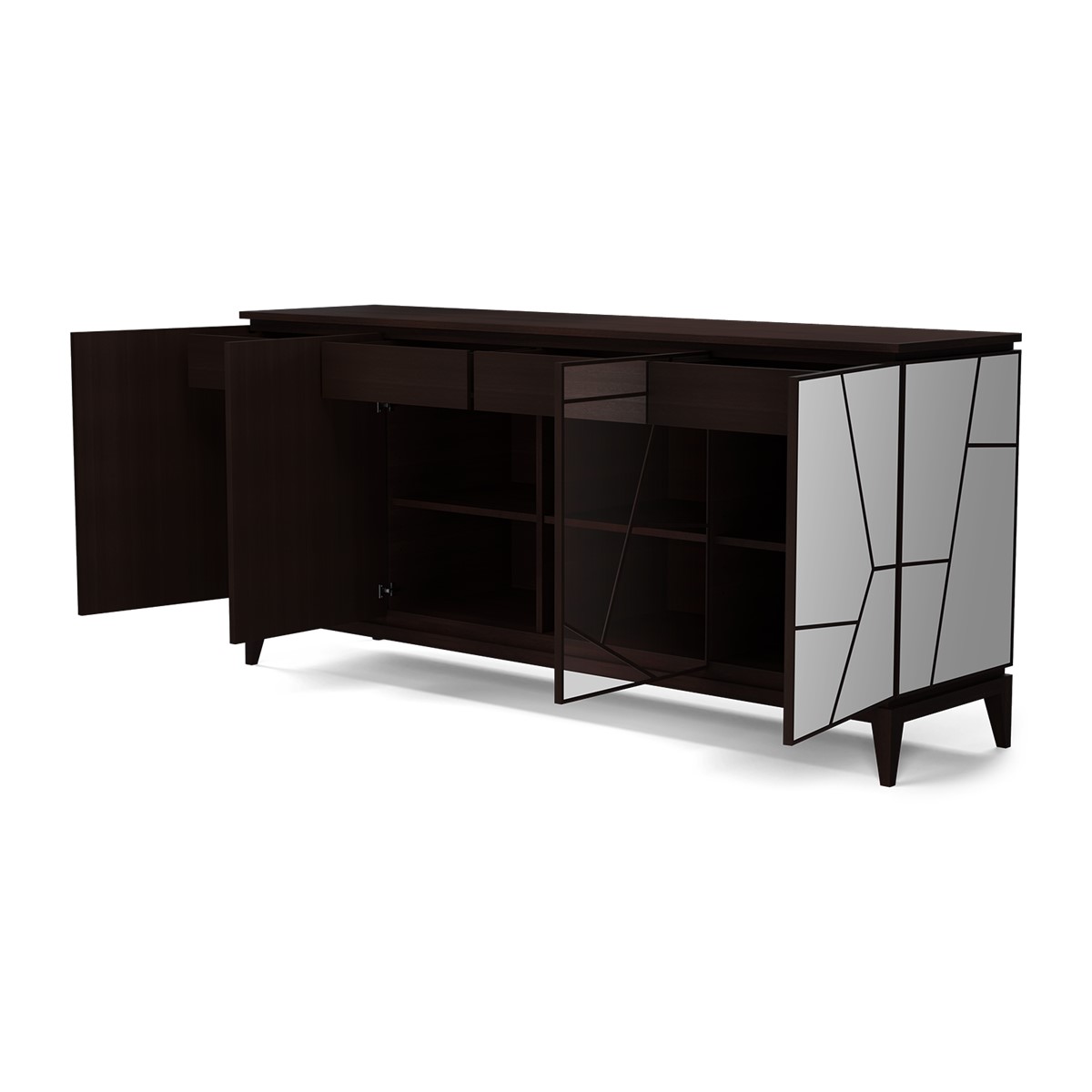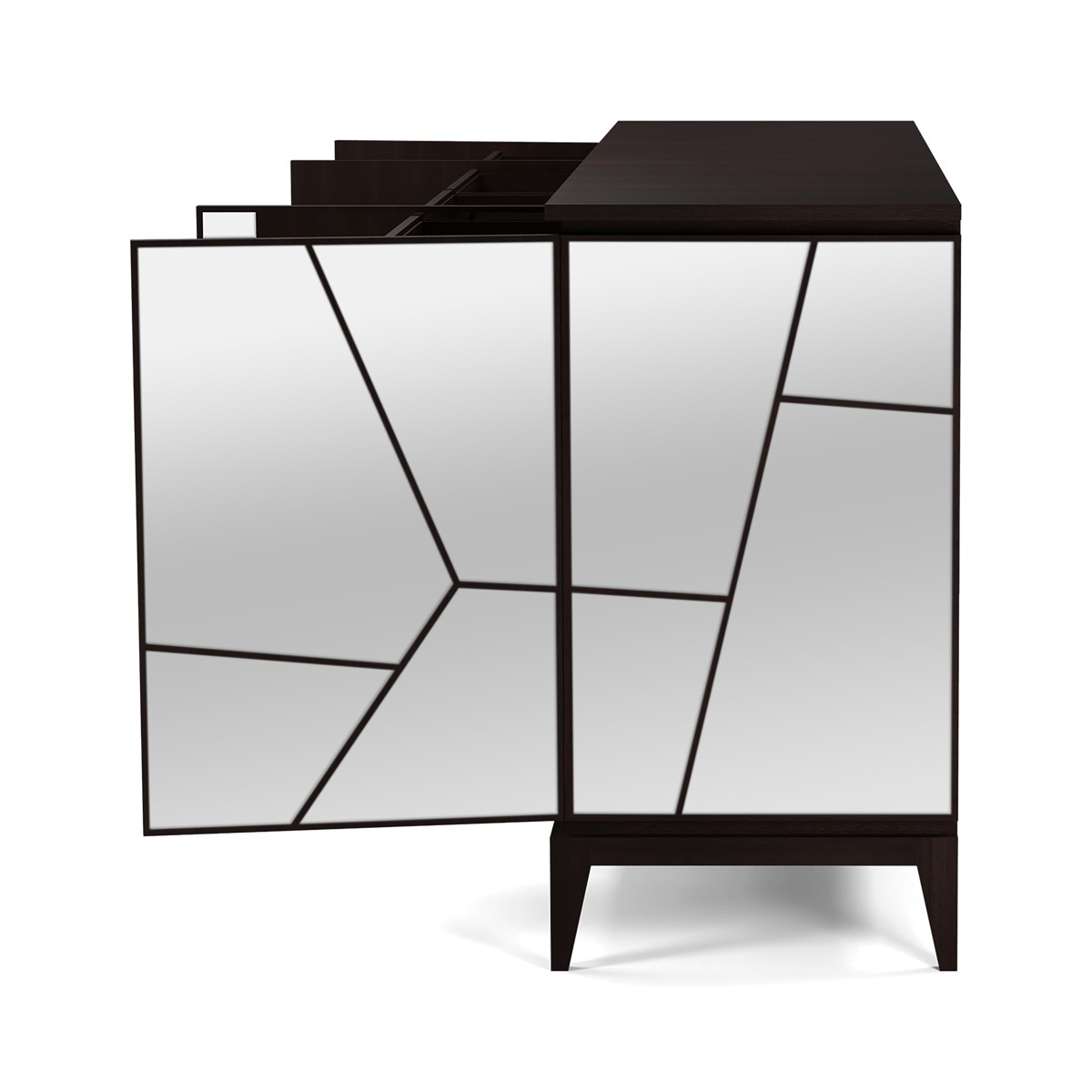 Named after the famous contemporary French architect, this sideboard features four doors, four drawers and eight compartments with adjustable shelves. This striking piece is hand carved in wood on an elegant wood base, and clad in geometric shaped mirror panes. Also available as a nightstand clad in leather panels (84-0061), a nightstand clad in mirror panes (84-0062), and a sideboard clad in leather panels (85-0087).