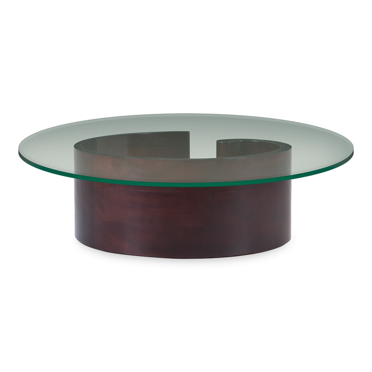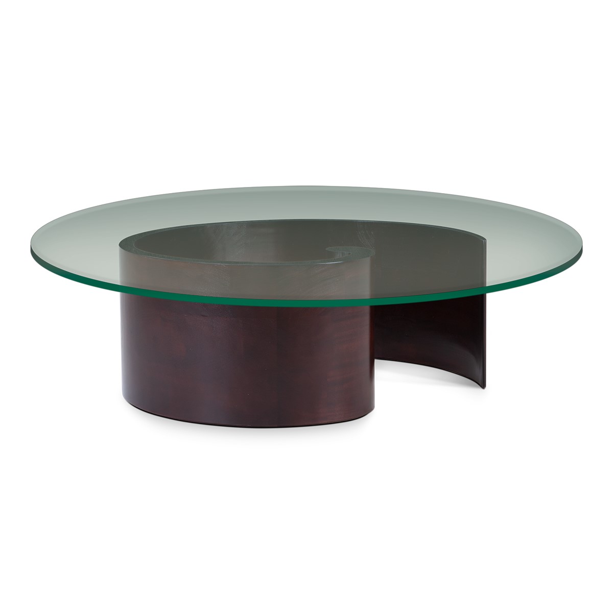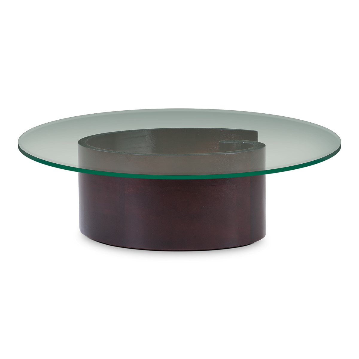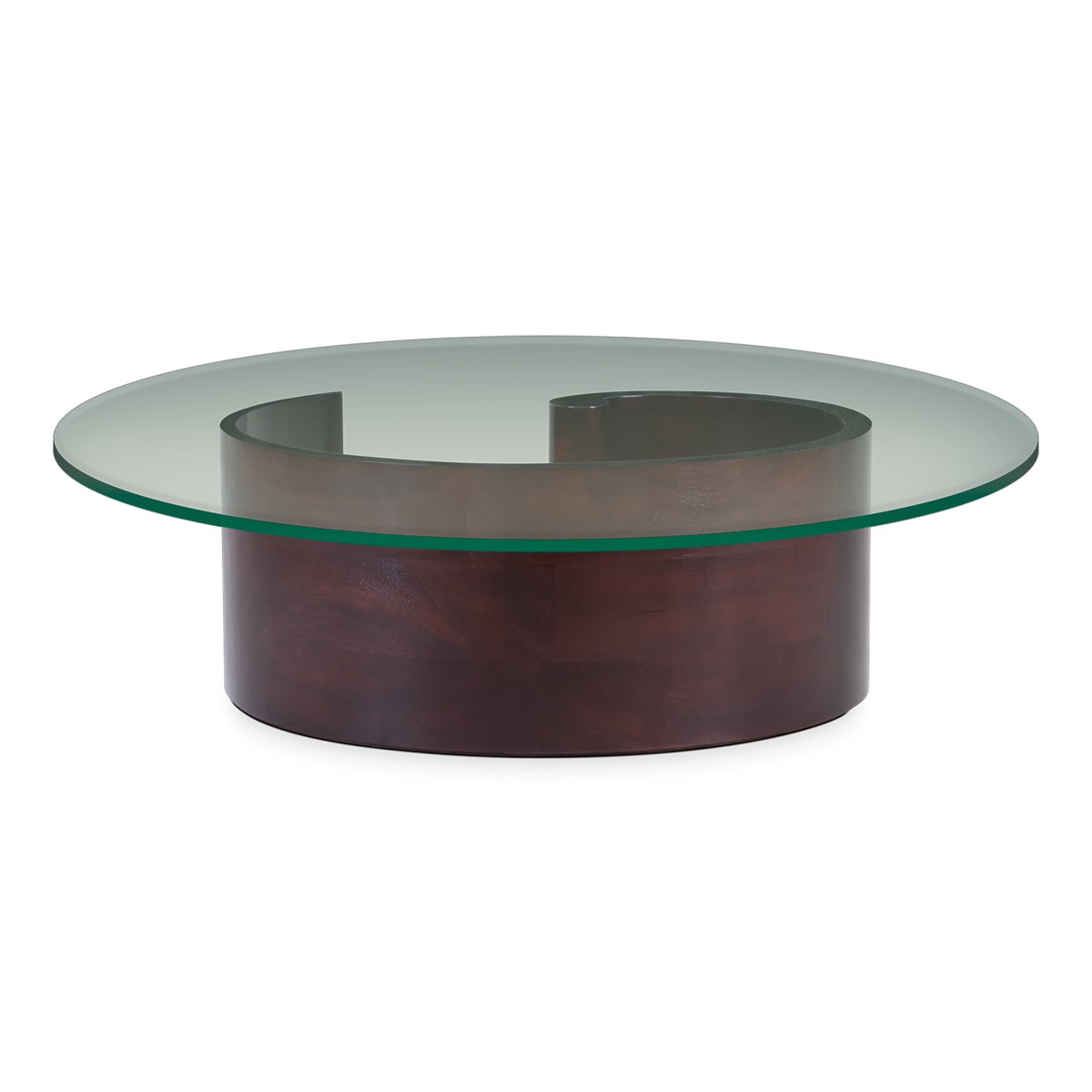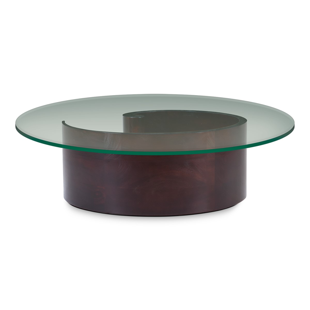 A giant curl of smooth hand carved wood forms the base of this spectacular round coffee table. Crowned with a clear glass top, this is an unusual take on the classic coffee table form, and a beautiful piece to suit any style of interior.