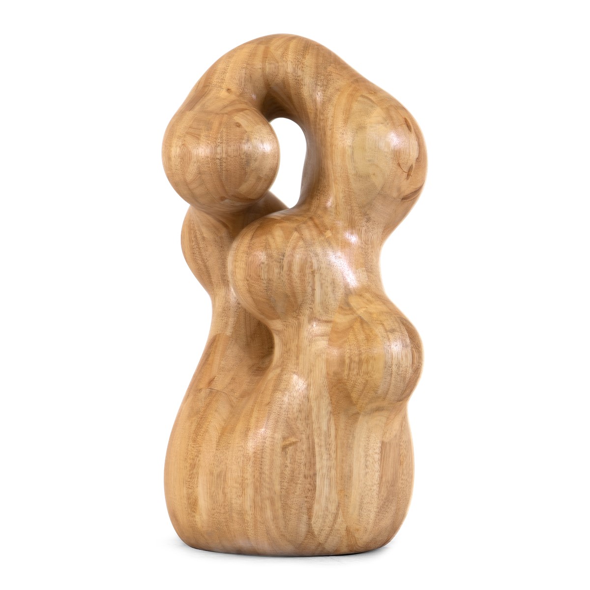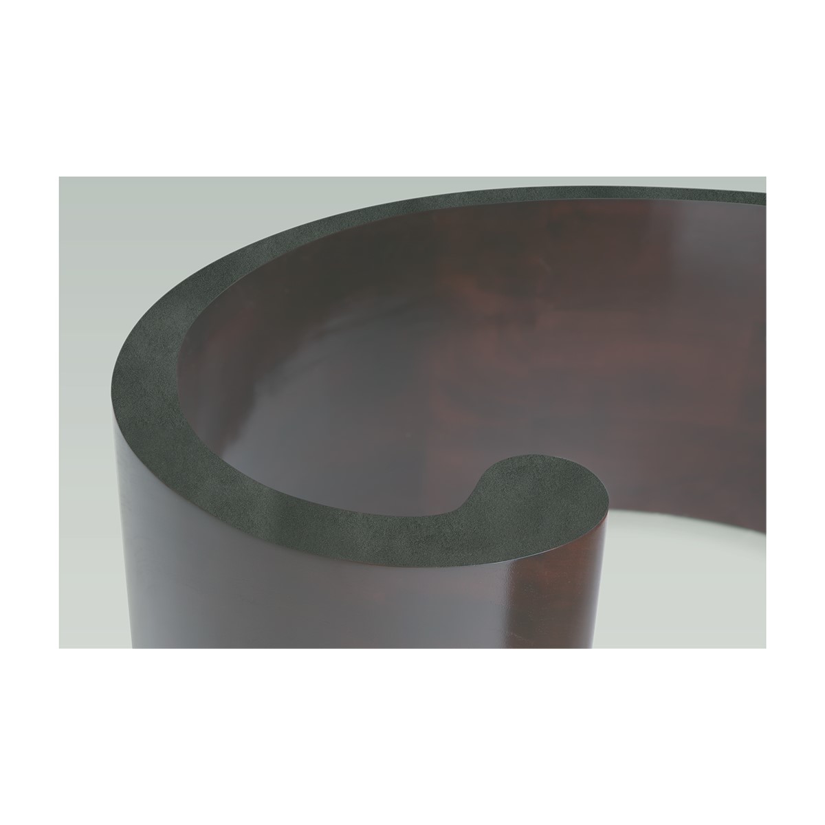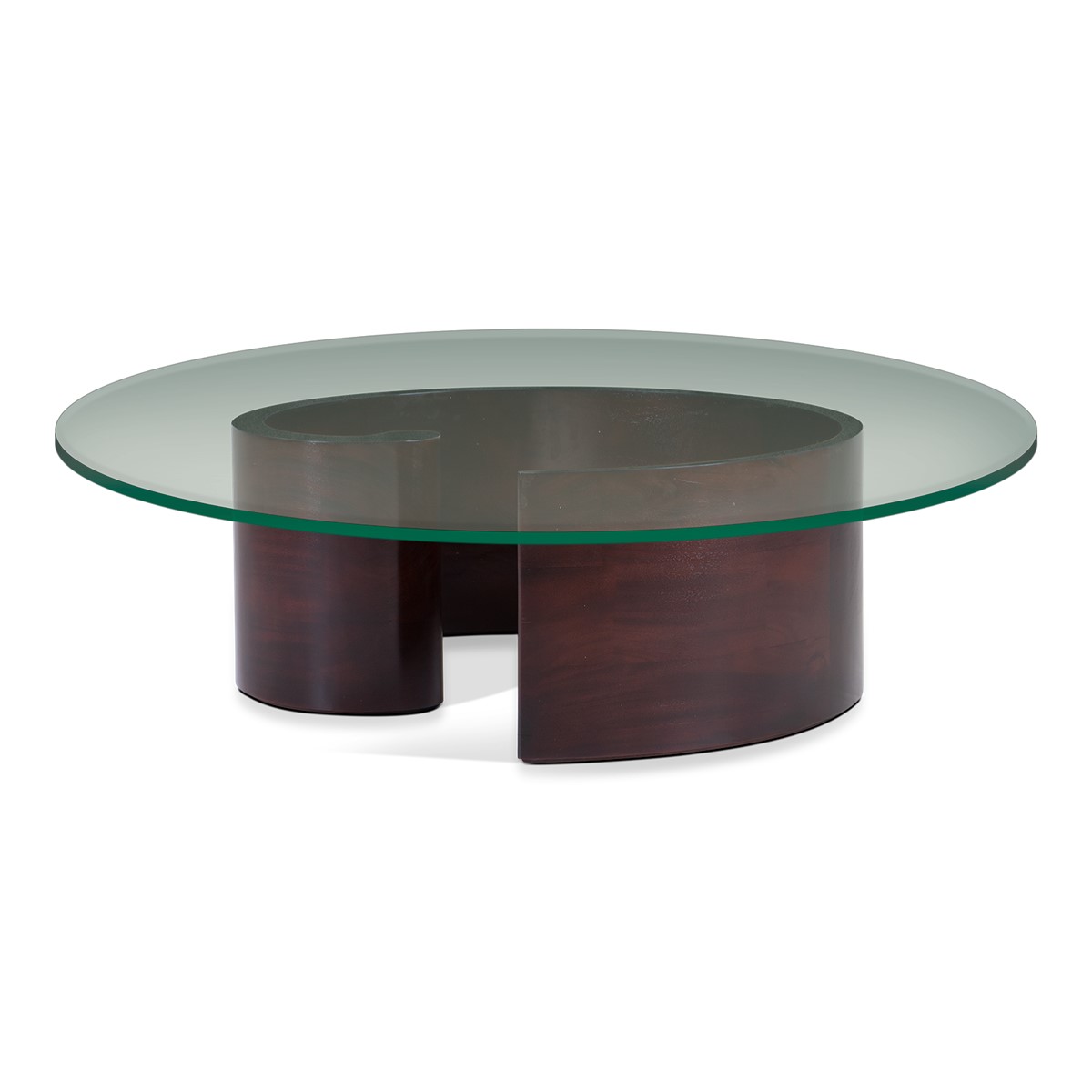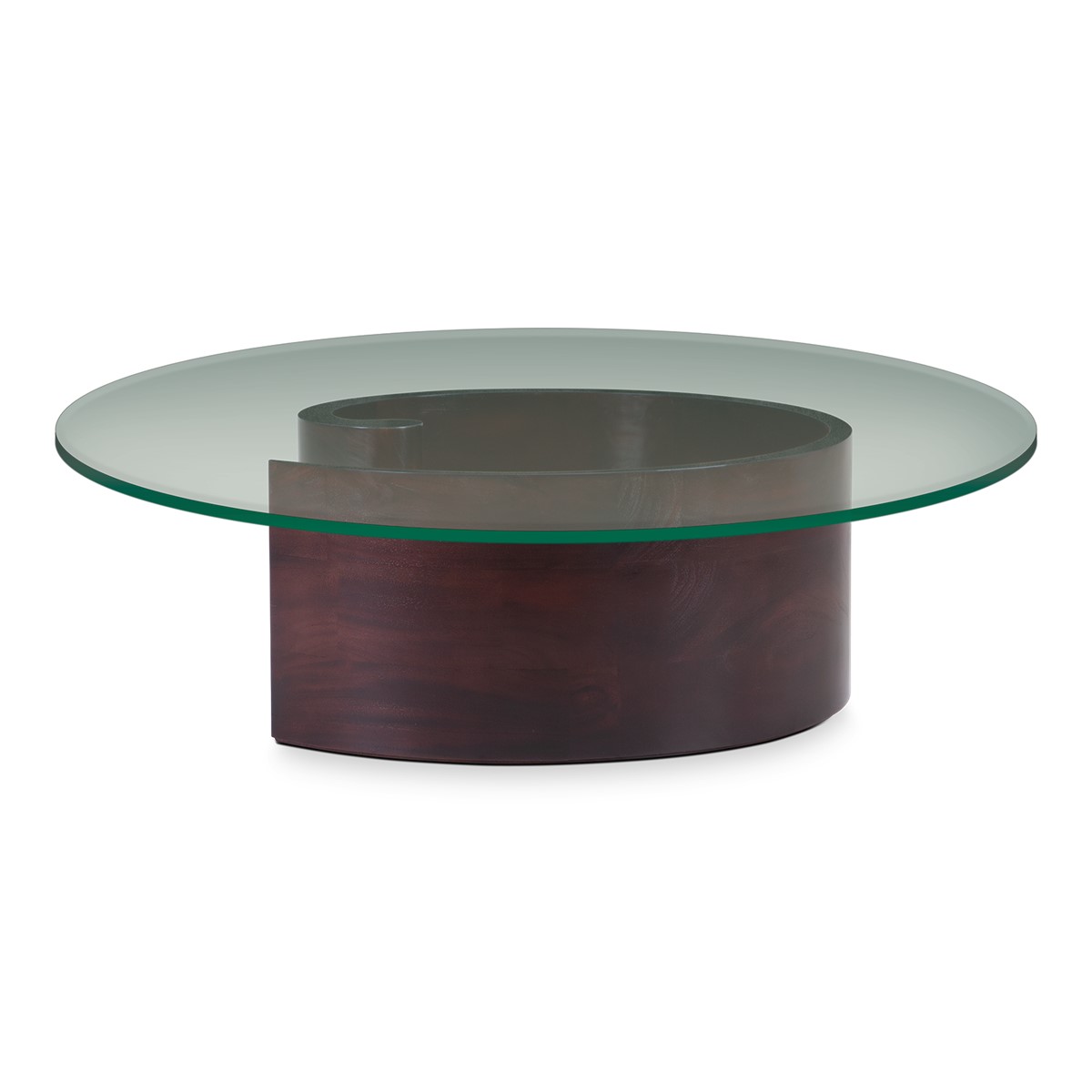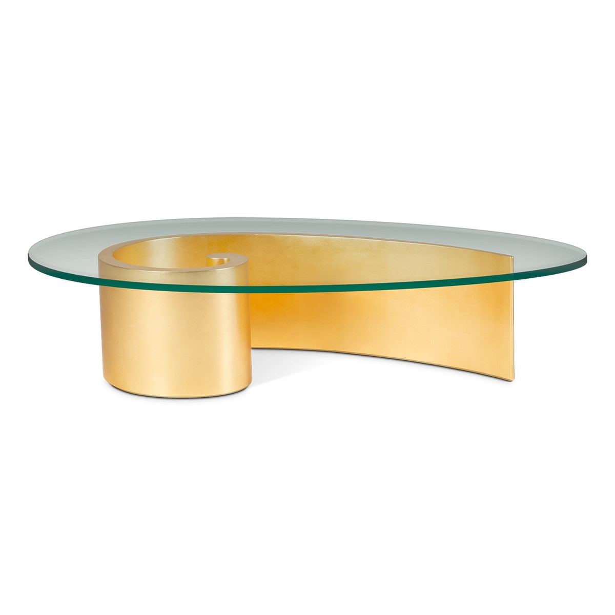 A giant curl of smooth hand carved wood forms the base of this spectacular round coffee table. Crowned with a clear glass top, this is an unusual take on the classic coffee table form, and a beautiful piece to suit any style of interior.