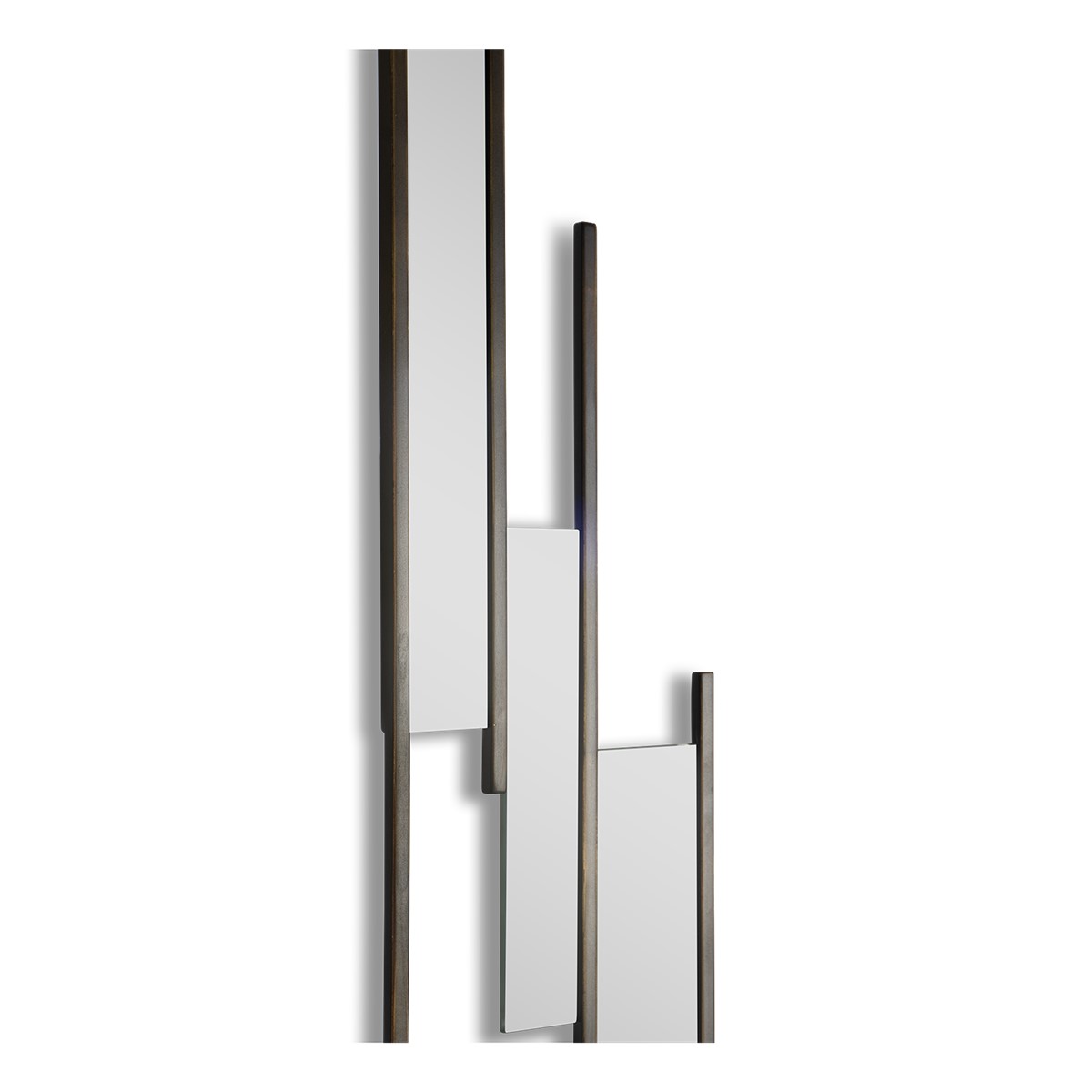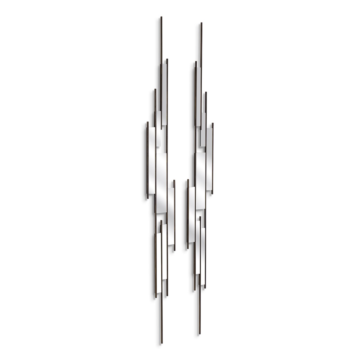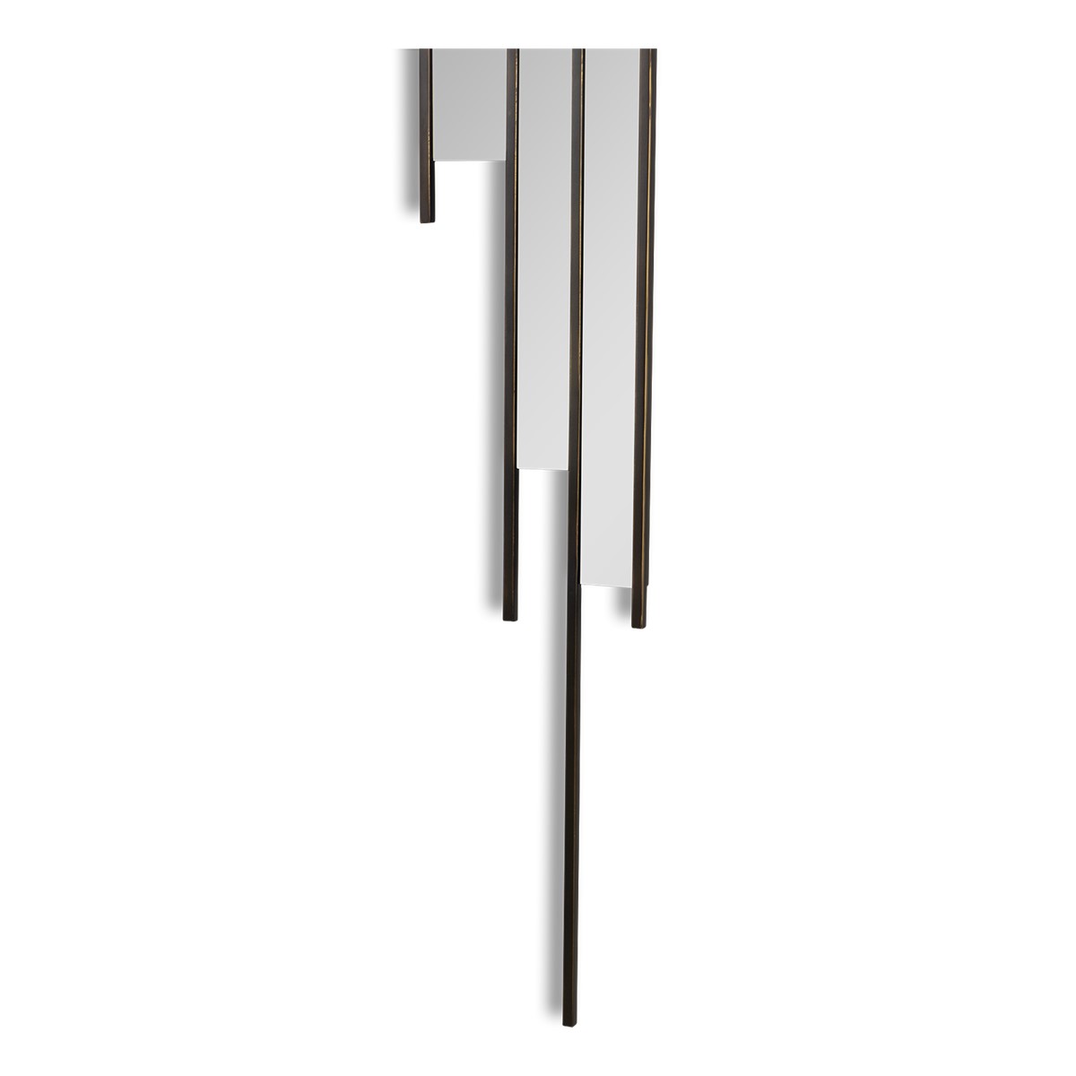 An awe-inspiring duo of tapered metal wall sconces featuring linear bronzage profiles inserted with beveled mirrors.