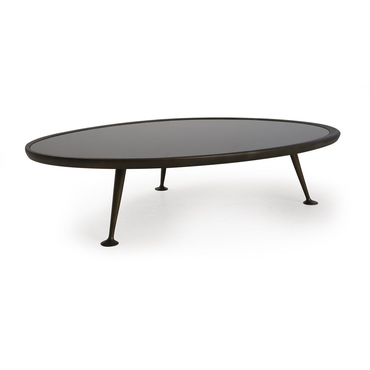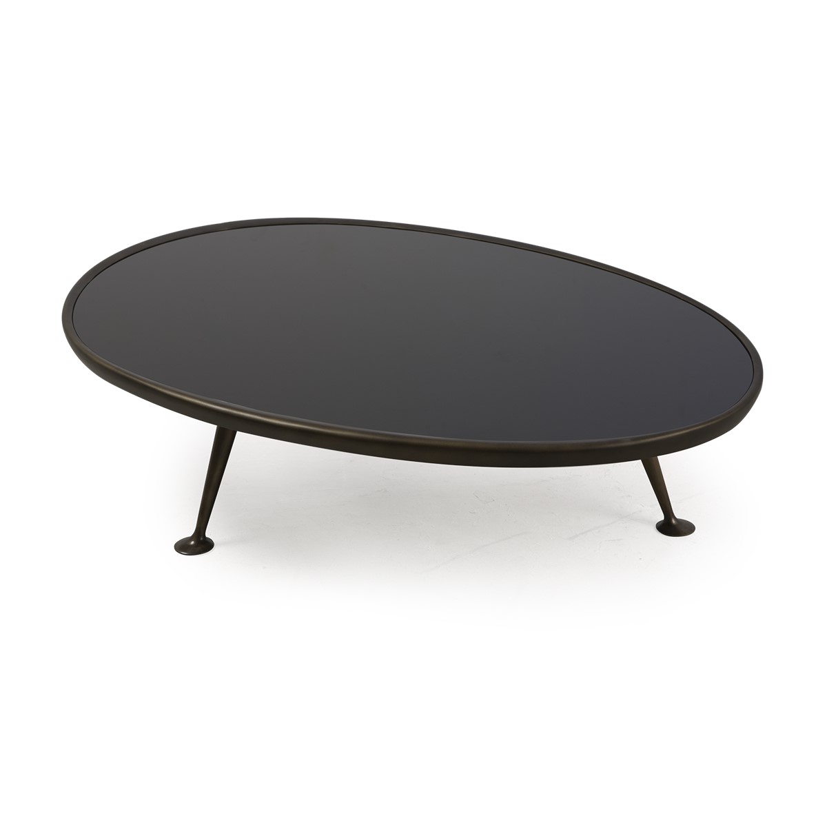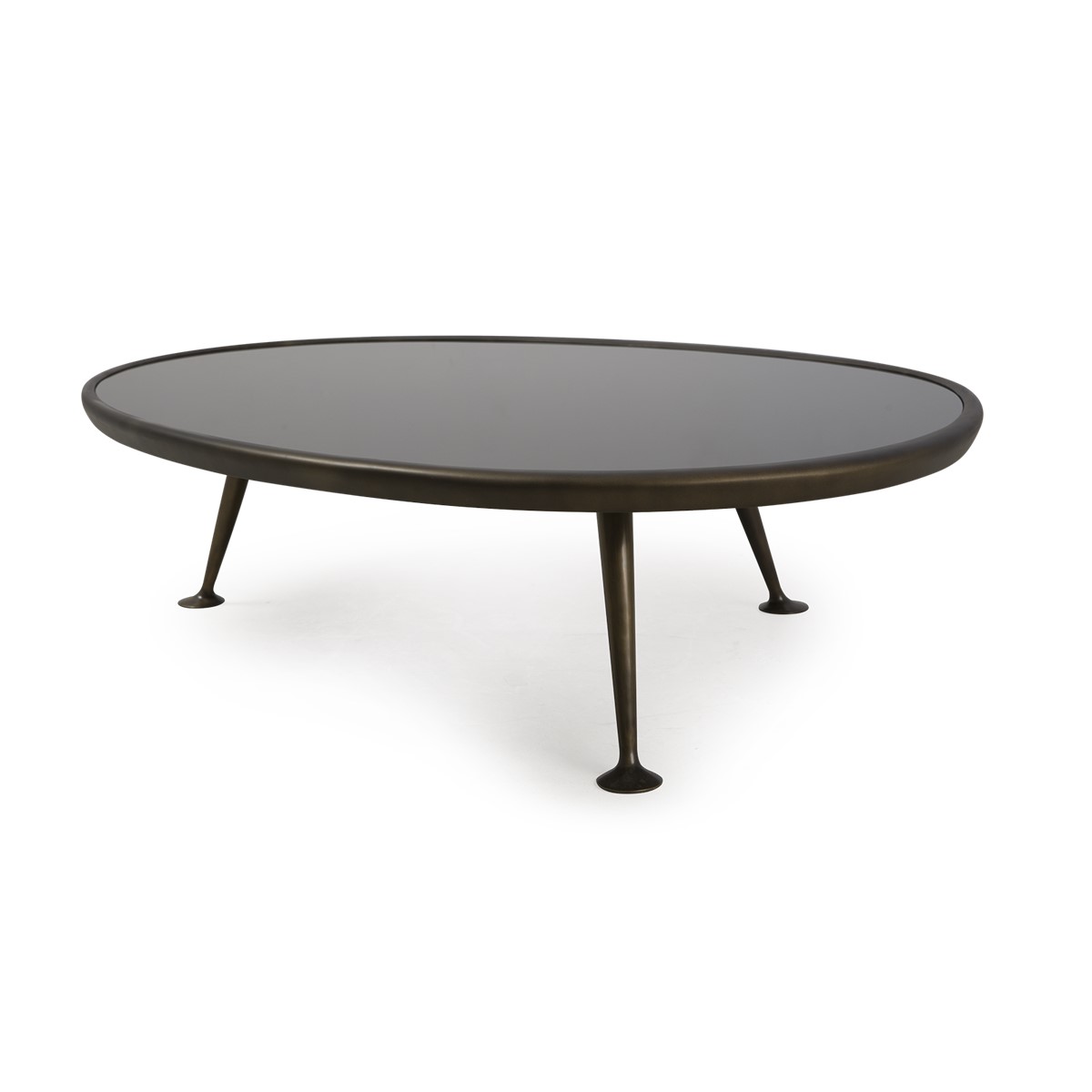 A retro-style coffee table, characterized by its solid brass ""dansette"" legs with a beautifully sculptured irregular black tinted glass top.