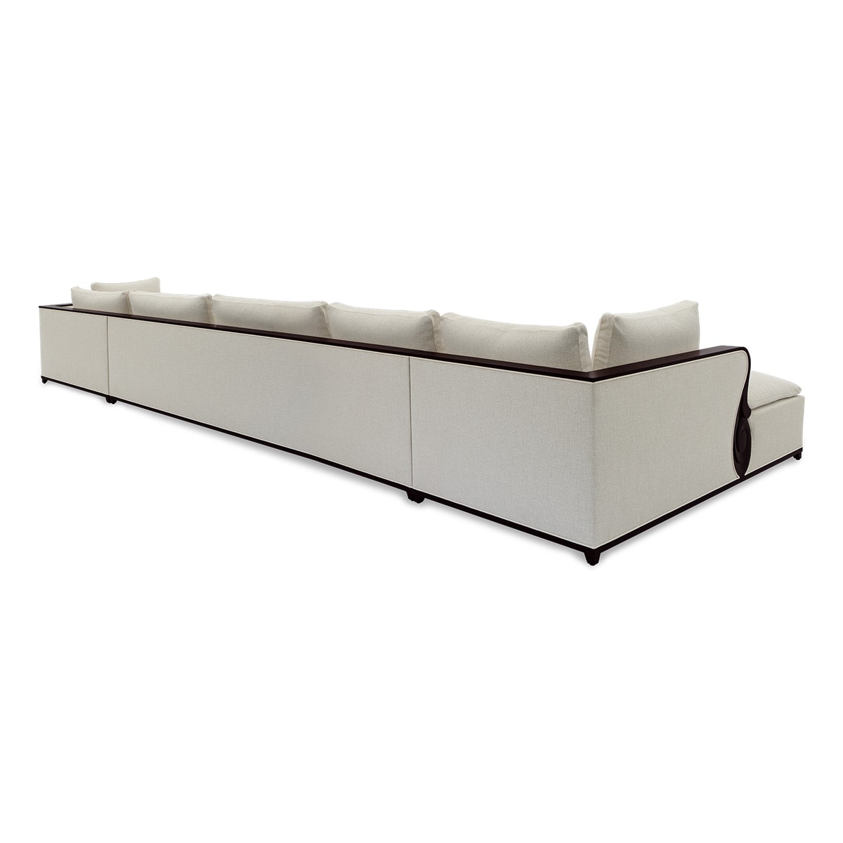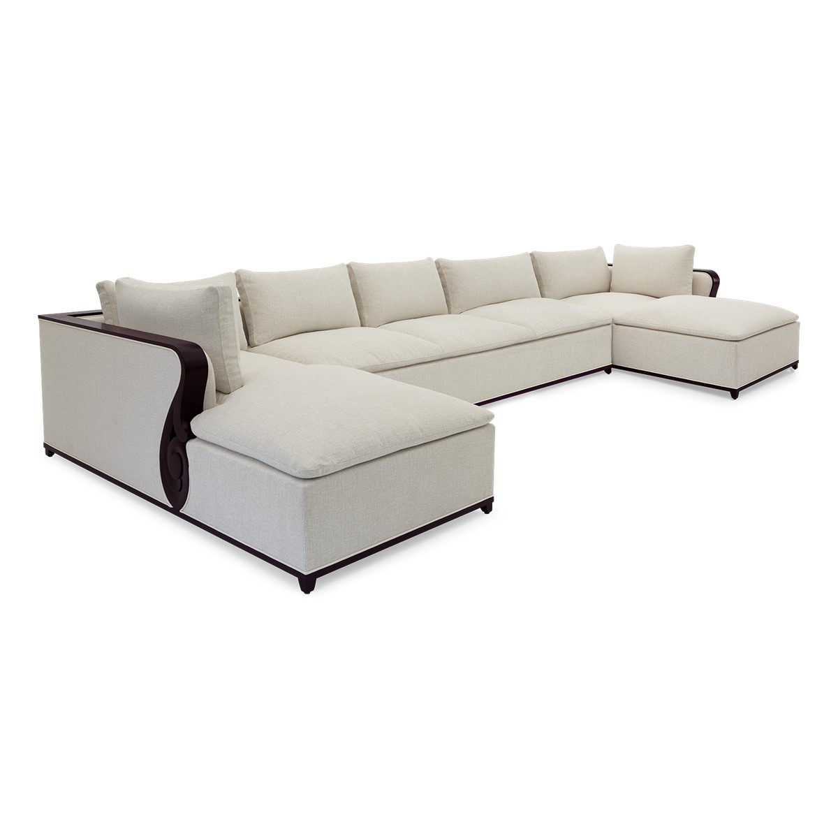 A fabulously chic U-shaped sectional sofa, featuring a carved mahogany ledge that flows along the arms and across the full length of the top surface to the opposite arm.