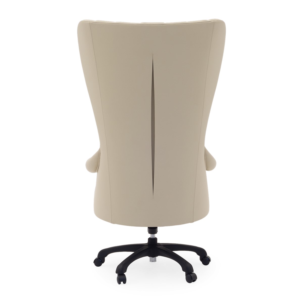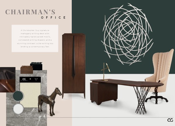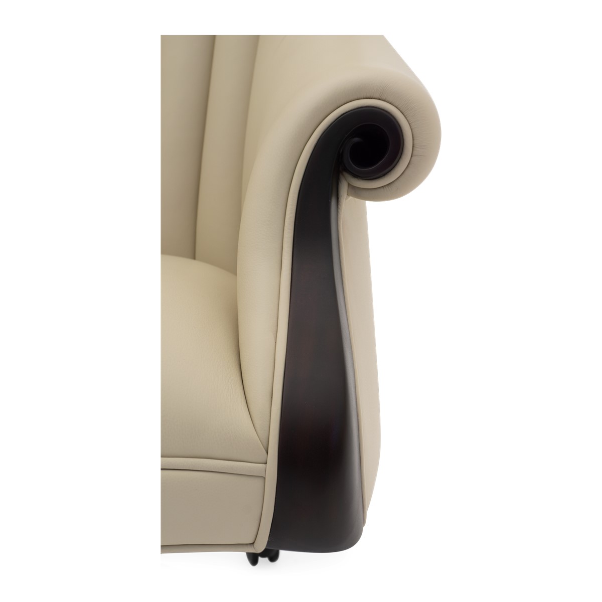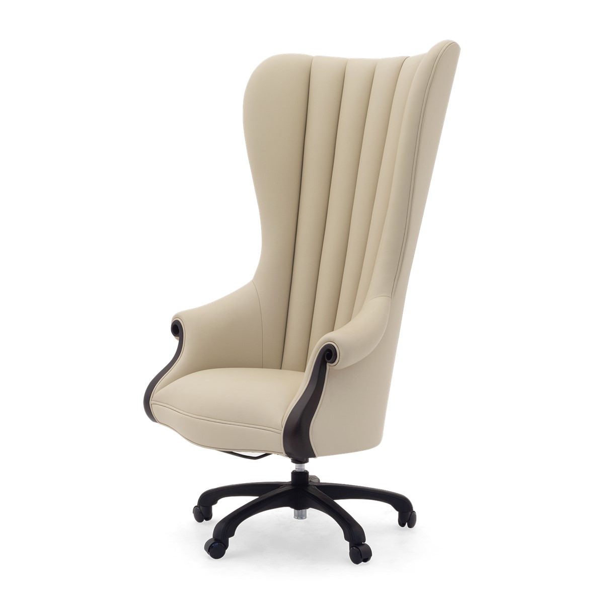This timeless and sumptuous chairman's office chair features delicately sculpted hand-carved mahogany arms and a plunging, hand-stitched scalloped back.