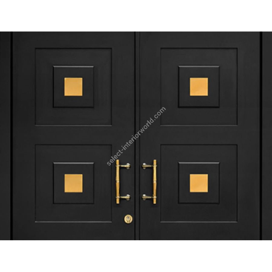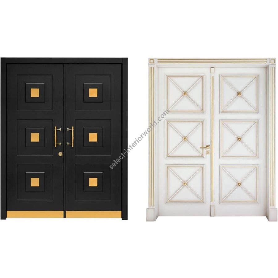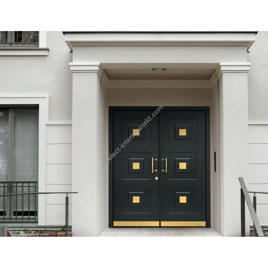 The entrance door model DIAMOND was developed by us especially for a building owner. Matching the interior door model MARBELLA-GOLD, he wanted an expressive, yet elegant entrance door in a stylish design The result is a DIAMOND, with goldcoloured applications on a deep black door leaf. The details, such as push handle, security rose and bumper plate are colour-coordinated. The finish of the door leaf, whether in color or with a fine wood veneer, as well as the stainless steel application, can be selected individually.