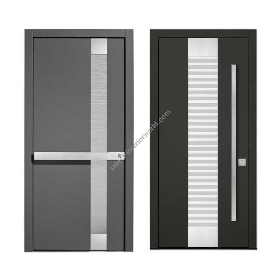 Entrance door with individual light cut-out framed by modules made of wood or stainless steel.