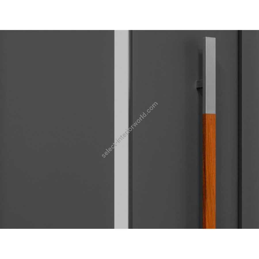 WEGA, the front door with light cut-out. The fine and flushed applications of the door leaf creates a timeless character and can be powder-coated, painted or oiled to match the color of the door leaf and hardware. The combination of wood in the module and in the handle has a very imperial effect.