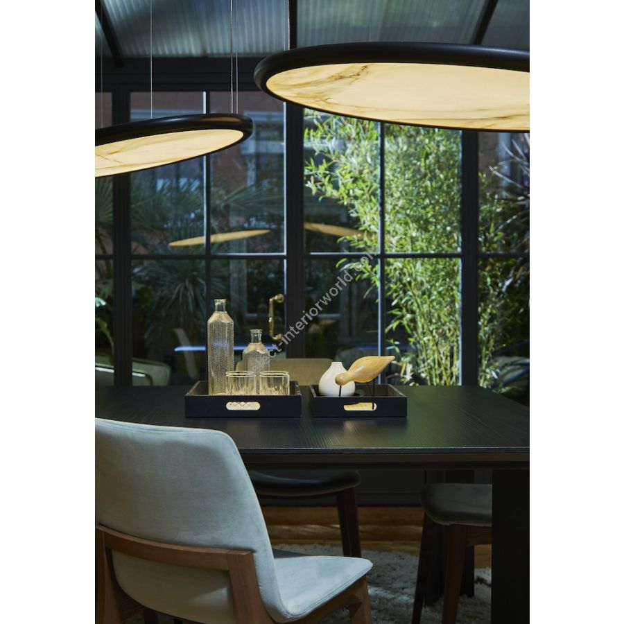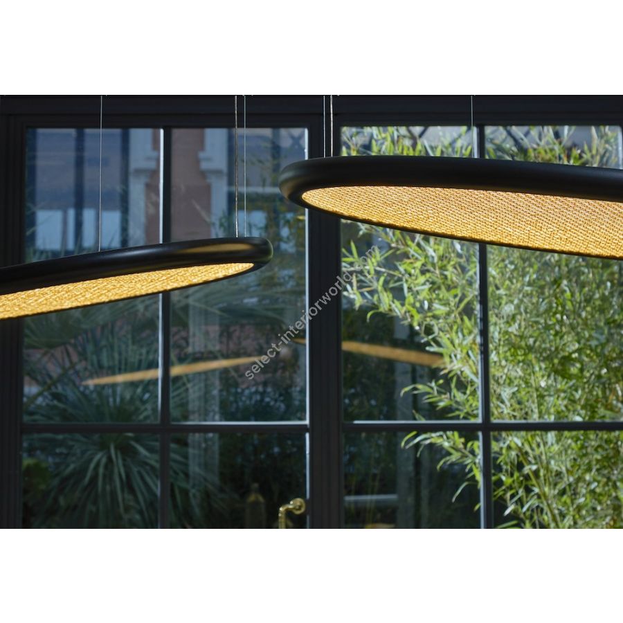 A light element that is fluid, like an object thrown upwards and which remains suspended. The idea of lightness is expressed, using a material that declares its contemporaneity, and which fits into our interiors with decisiveness and elegance. The luminous part, covered in Viennese straw set within a black lacquered oval, has a vintage yet very modern flavour – a style that reminds us of Brazilian and South American modernist interiors of the 1960s and 70s.