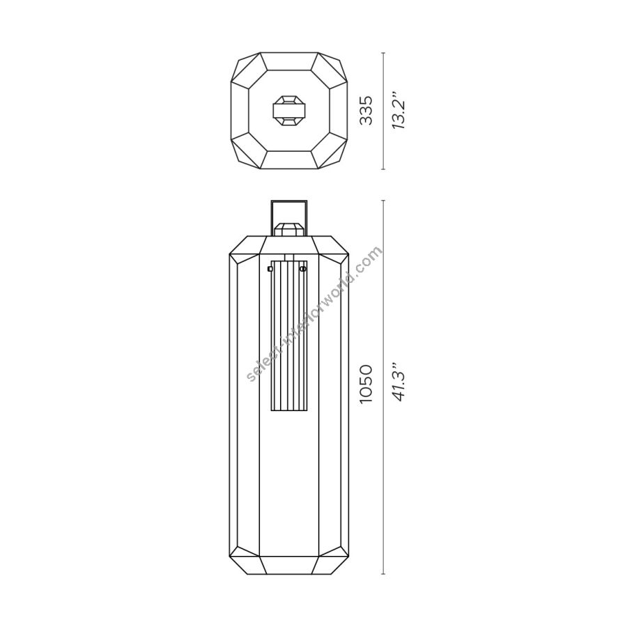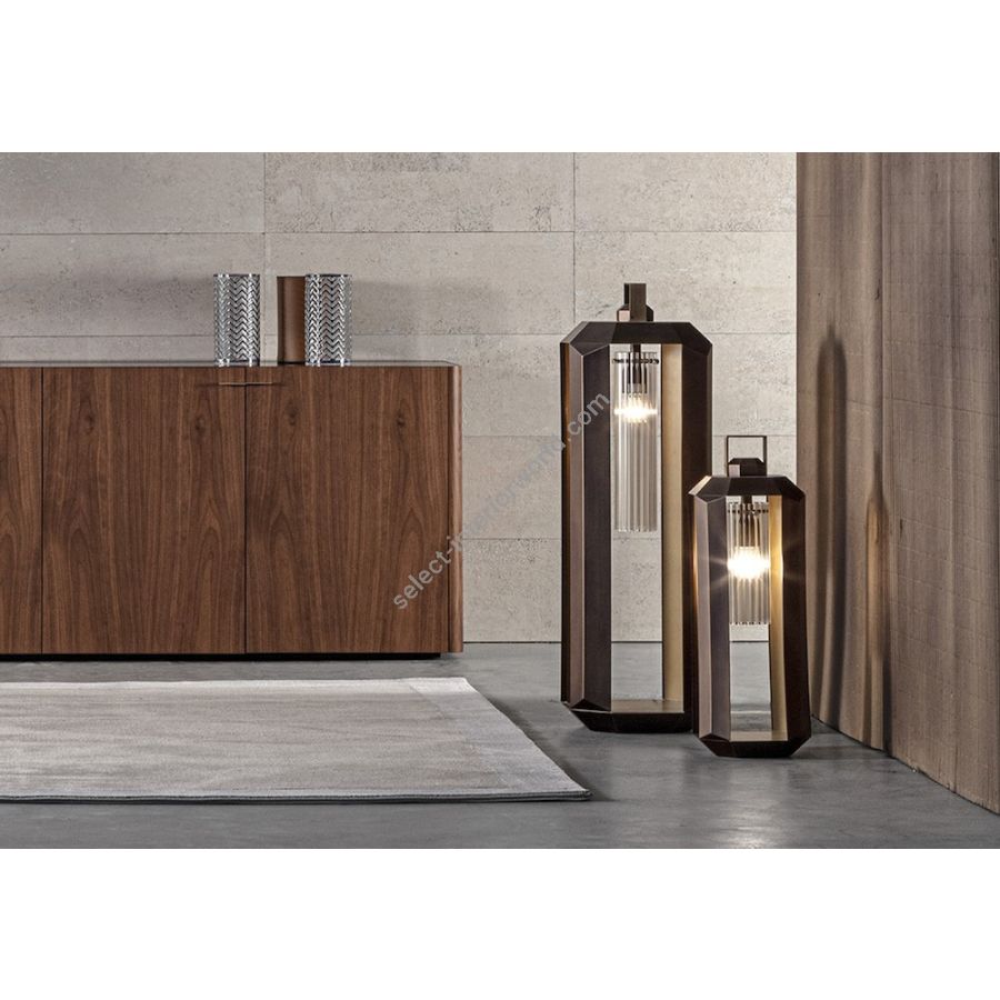 A table lantern in two dimensions. The external structure, in composite material, is finished in bronze using new painting techniques with metal powders: the satin bronze effect is so flawless that it is virtually impossible to tell whether it is metal or not. The inner part of the lantern is in gold-painted metal, which creates an elegant contrast. The ribbed glass of the diffuser enhances the product.