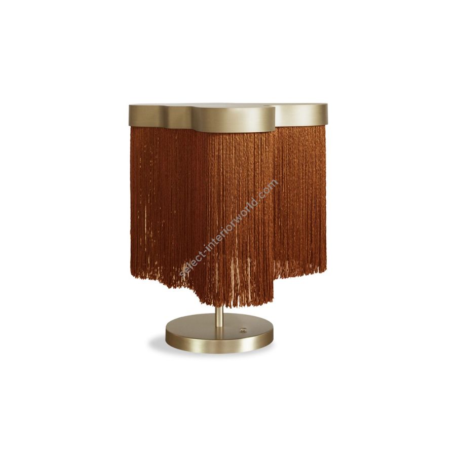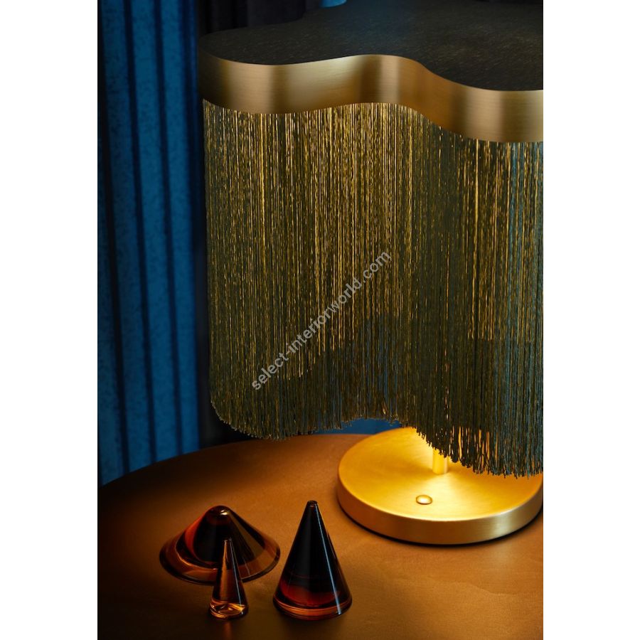 The Arcipelago collection is composed of suspension and table lights, characterised by the Trevira CS fire-resistant shade with fringes and a satin brass body – details that enrich the product. The light source is an LED customised and dimmable plate, which can be regulated through a three-phase dimmer switch on the base in the table version.