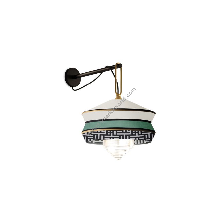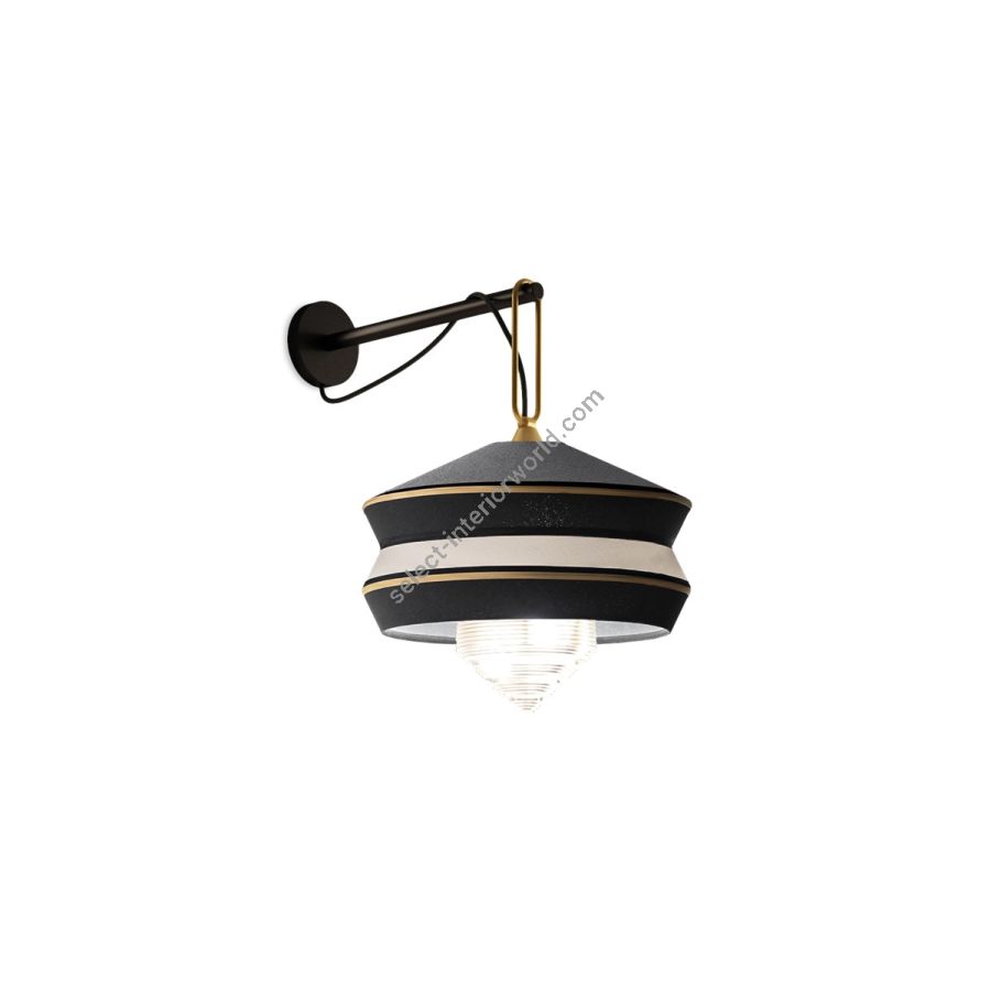 The wall lamp version is characterised by a thin and elegant arm with a matt silk black lacquered finish. It also has a satin brass ring that supports the lamp.