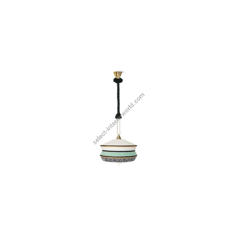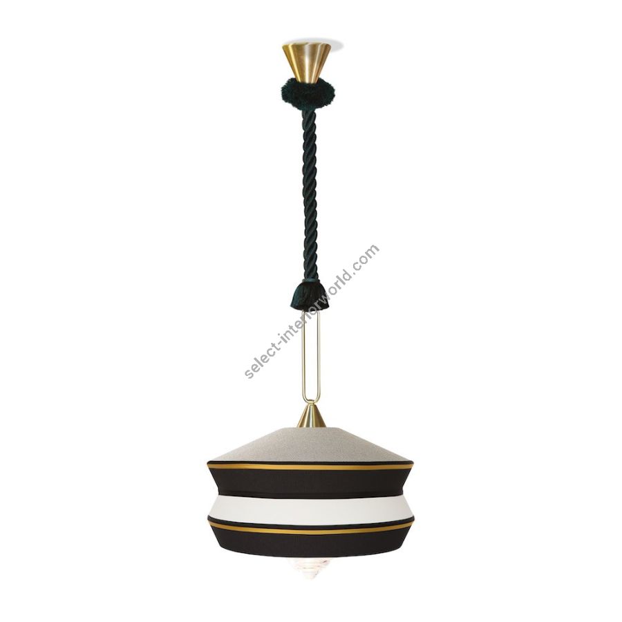 Calypso is a collection of suspension lights inspired by the art deco period, with fabrics whose textures and geometric patterns in black and white mixed with bright colours inspired by the South American and tropical culture, proves a very original result. The indoor version is characterized by a green braided silk cord. The support is a satin brass ring. The diffuser is in transparent glass.