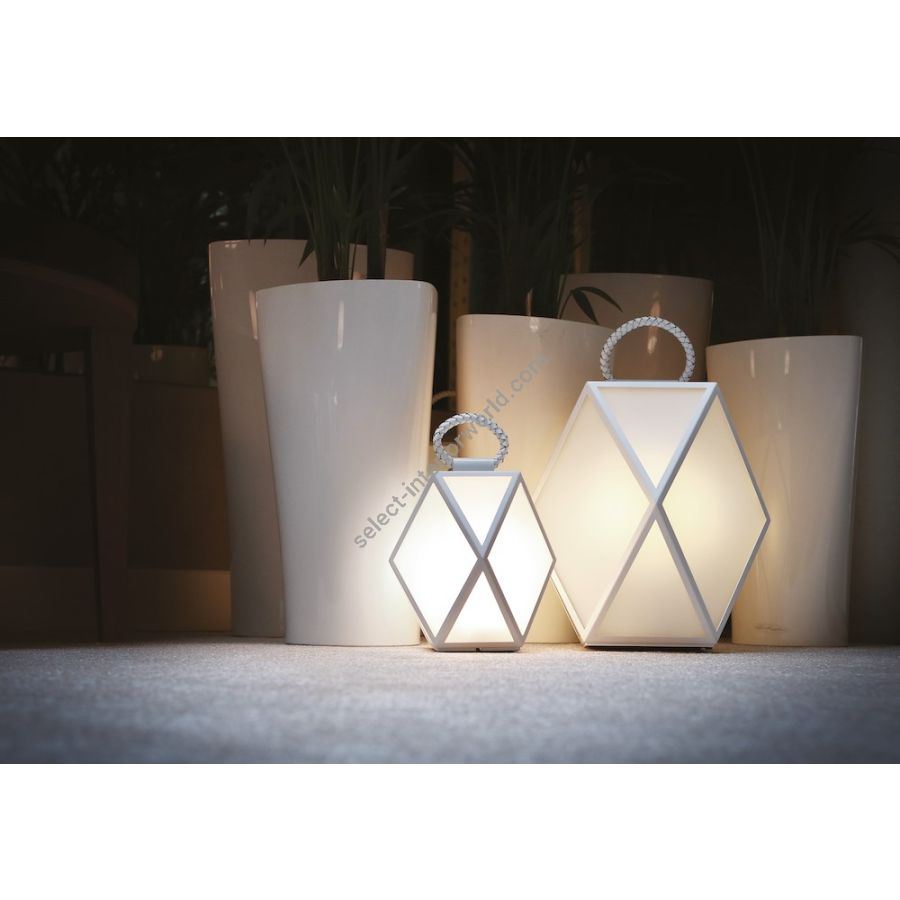 A distinctive and innovative lantern, featuring elements, such as the braided leather handle, for an exclusive and refined outdoor area. The rechargeable battery version is widely used, with increasing applications in both the commercial and maritime sectors. The battery version is now available in small, medium and large sizes.