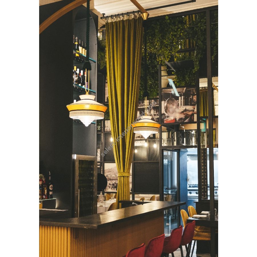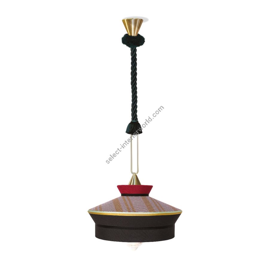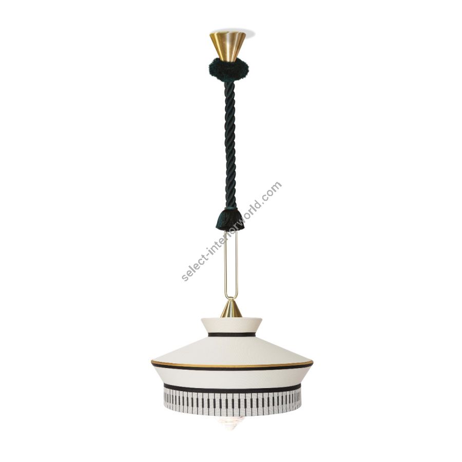 Calypso is a collection of suspension lights inspired by the art deco period, with fabrics whose textures and geometric patterns in black and white mixed with bright colours inspired by the South American and tropical culture, proves a very original result. The indoor version is characterized by a green braided silk cord. The support is a satin brass ring. The diffuser is in transparent glass.